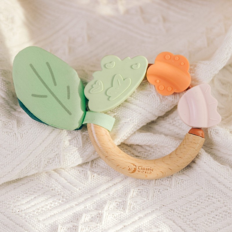 Drewniana grzechotka marki Classic World to bezpieczna, stylowa i przyjazna środowisku zabawka stworzona specjalnie dla maluszków! Grzechotka nie tylko umila czas dziecku poprzez delikatne, stymulujące dźwięki, ale również przynosi ulgę podczas ząbkowania. Połączenie naturalnego drewna i miękkiego silikonu pobudza zmysły oraz zachęca do odkrywania świata, stanowiąc doskonały pierwszy gryzak i grzechotkę dla każdego maluszka.