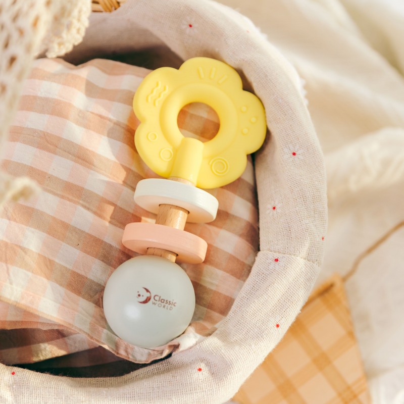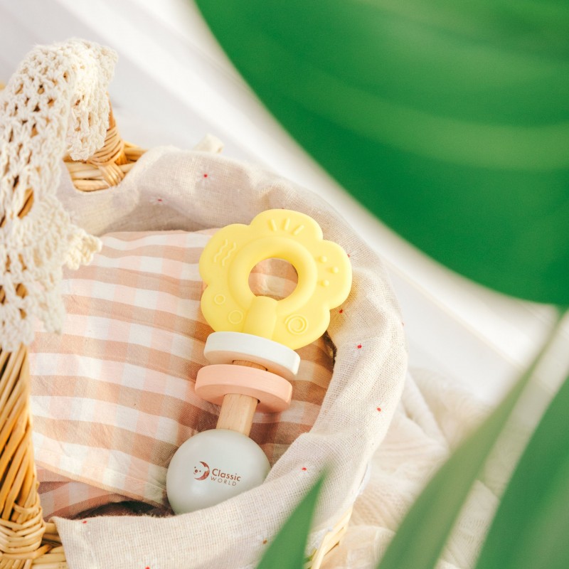 Urocza grzechotka w kształcie kwiatka zaprojektowana została z myślą o najmłodszych dzieciach. Delikatne, pastelowe kolory przyciągają uwagę maluszka, a przyjemna w dotyku powierzchnia i odpowiedni rozmiar sprawiają, że łatwo ją chwycić i potrząsać. Zabawka została stworzona z bezpiecznych materiałów – drewna i silikonu – dzięki czemu nadaje się dla dzieci już od pierwszych dni życia.