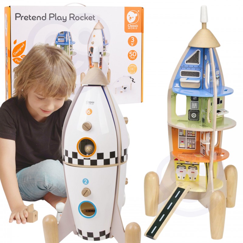 Zestaw Drewniana Rakieta Kosmiczna od marki Classic World to imponująca zabawka, która łączy w sobie radość z konstruowania i kreatywną zabawę w odgrywanie ról. Ten wielki statek kosmiczny pozwala dziecku na samodzielny montaż zewnętrznych paneli za pomocą śrub, a także budowanie bazy ekspedycyjnej z drewnianych patyczków. Wnętrze rakiety kryje aż 12 tematycznych pomieszczeń, takich jak sypialnia, sala operacyjna czy laboratorium, co zapewnia niekończące się możliwości tworzenia kosmicznych historii. To idealna propozycja dla małych odkrywców, którzy marzą o międzygalaktycznych podróżach.