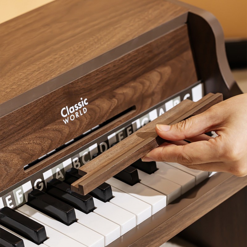 Pianino Classic Modern Natural od marki Classic World to wyjątkowy instrument muzyczny, który wprowadzi Twoje dziecko w fascynujący świat dźwięków. To pięknie wykonane, drewniane pianino charakteryzuje się nie tylko eleganckim, nowoczesnym designem, ale przede wszystkim wysoką jakością wykonania, która zapewnia autentyczność i naturalność brzmienia. Tekstura drewna podkreśla jego wrodzoną czystość i piękno, tworząc przytulną i harmonijną atmosferę w dziecięcym pokoju. Do zestawu dołączona jest książeczka z nutami oraz naklejki, które pomagają dzieciom w łatwiejszym odnajdywaniu odpowiednich klawiszy, sprawiając, że nauka gry staje się prosta i radosna. To idealny pierwszy instrument dla małego wirtuoza, który wspiera rozwój artystyczny od najmłodszych lat.