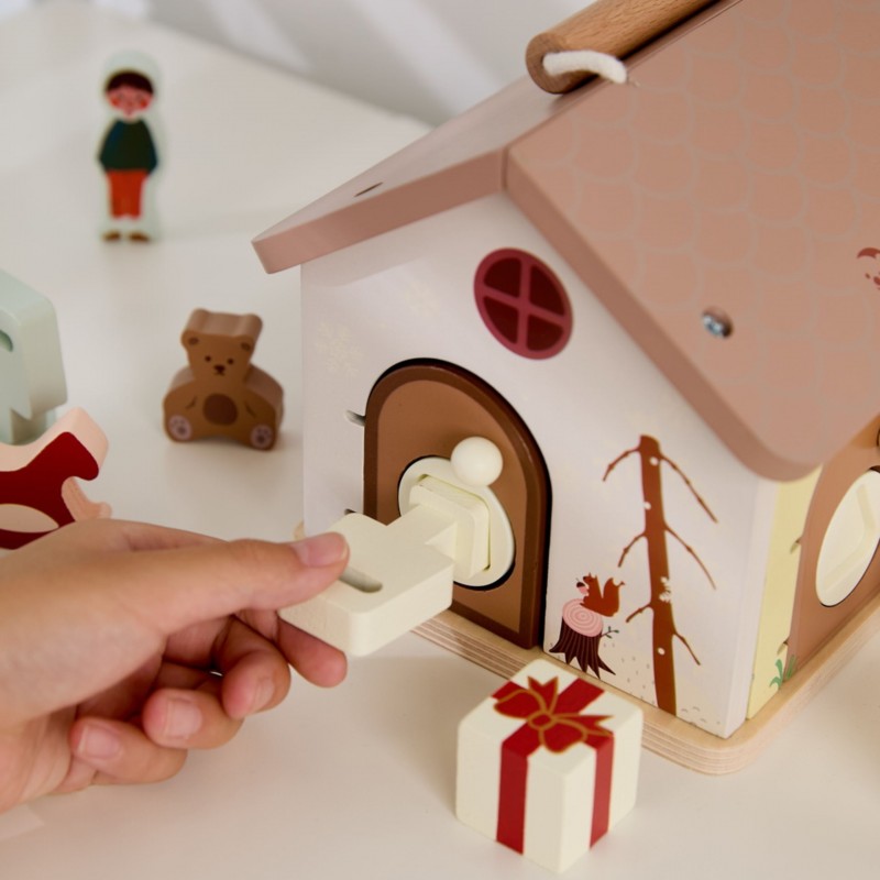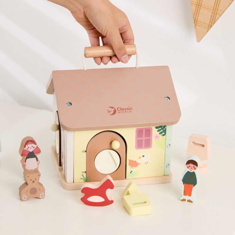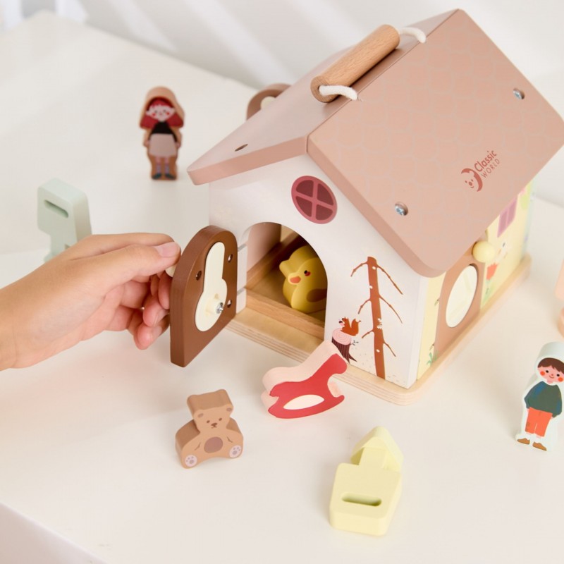 Drewniany Domek Edukacyjny z Zamkami to zabawka sensoryczna, która zachęca malucha do ekscytującej eksploracji! Ten uroczy domek marki CLASSIC WORLD wyposażony jest w 4 drzwiczki, a za każdymi kryje się sprytny mechanizm blokujący.Sens tej zabawki polega na dopasowaniu kluczyka o odpowiednim kształcie do pasujących do niego drzwiczek (z identycznym kształtem otworu). W środku na odkrywcę czekają kolorowe klocki z wesołymi ilustracjami przedstawiającymi m.in. małego misia i urodzinowy prezent, co idealnie wpisuje się w motyw przewodni zabawki. Otwieranie i zamykanie kolejnych drzwi to świetny trening małej motoryki, zręczności i logicznego myślenia. Zabawka jest wykonana z trwałego, bezpiecznego drewna, zaprojektowana, by wzbudzać radość odkrywania i wyobraźnię u dzieci już od 18 miesiąca życia.