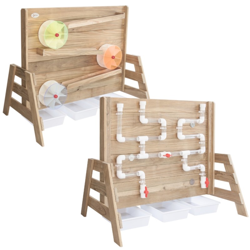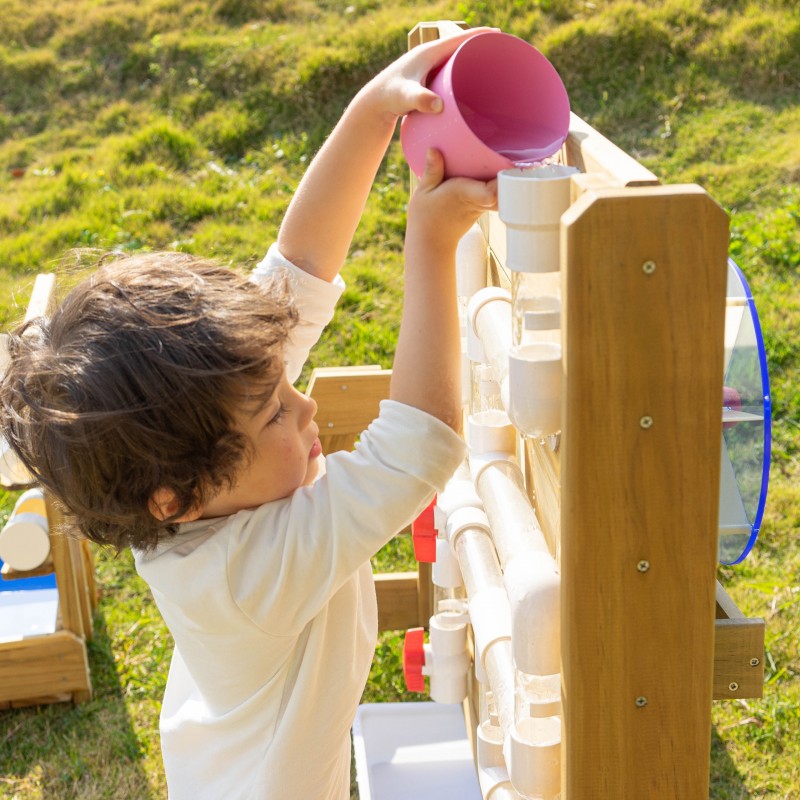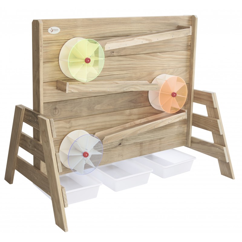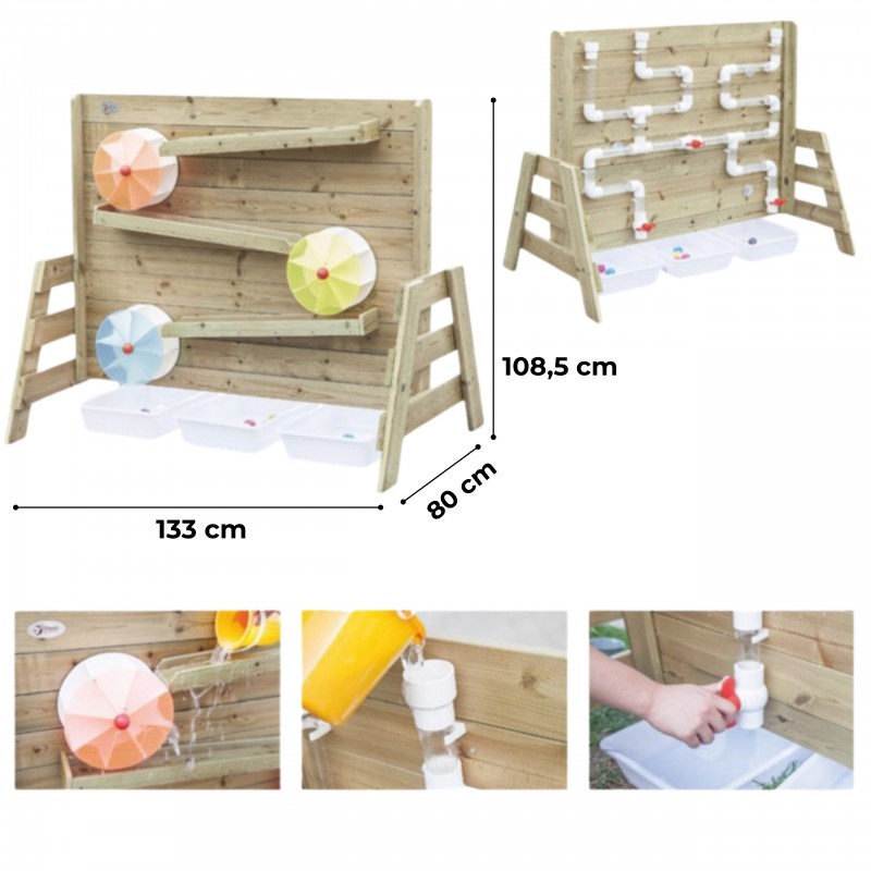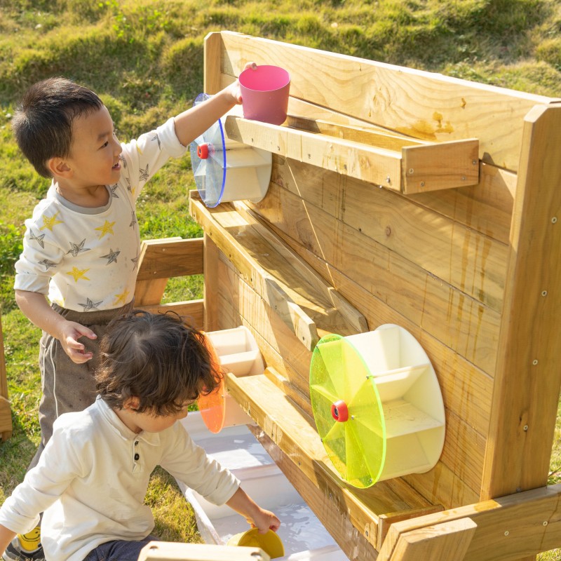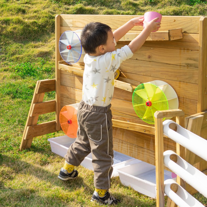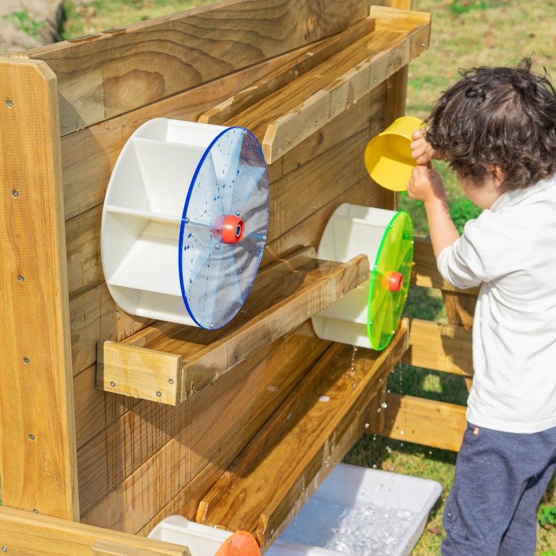 Drewniana Ściana Zabawa Wodą od renomowanej marki Classic World to idealne dopełnienie ogrodowego placu zabaw. Produkt został wyprodukowany z wysokiej jakości impregnowanego drewna sosnowego, pokrytego nietoksycznym i bezpiecznym dla dzieci preparatem. Dzięki starannej impregnacji konstrukcja jest odporna na warunki atmosferyczne, co gwarantuje jej długowieczność oraz estetyczny wygląd przez wiele lat użytkowania na zewnątrz. Jest to ekologiczna, dwustronna zabawka zaprojektowana do fascynujących eksperymentów z użyciem naturalnych materiałów. Z jednej strony należy nasypać piasek na drewnianą półkę i obserwować, jak przesypuje się w dół, co powoduje obracanie się zamontowanego młynka. Z drugiej strony ścianki znajdują się systemy tuneli, do których można wlać wodę. Taka forma aktywności to niekończąca się zabawa, która w przystępny sposób uczy mechanizmów napędzania i wprowadzania koła w ruch. Zabawka została wykonana z biodegradowalnych materiałów, gwarantując bezpieczne środowisko zabawy dla każdej pociechy.