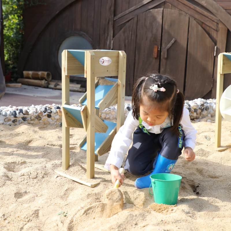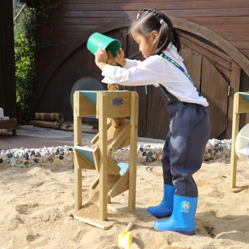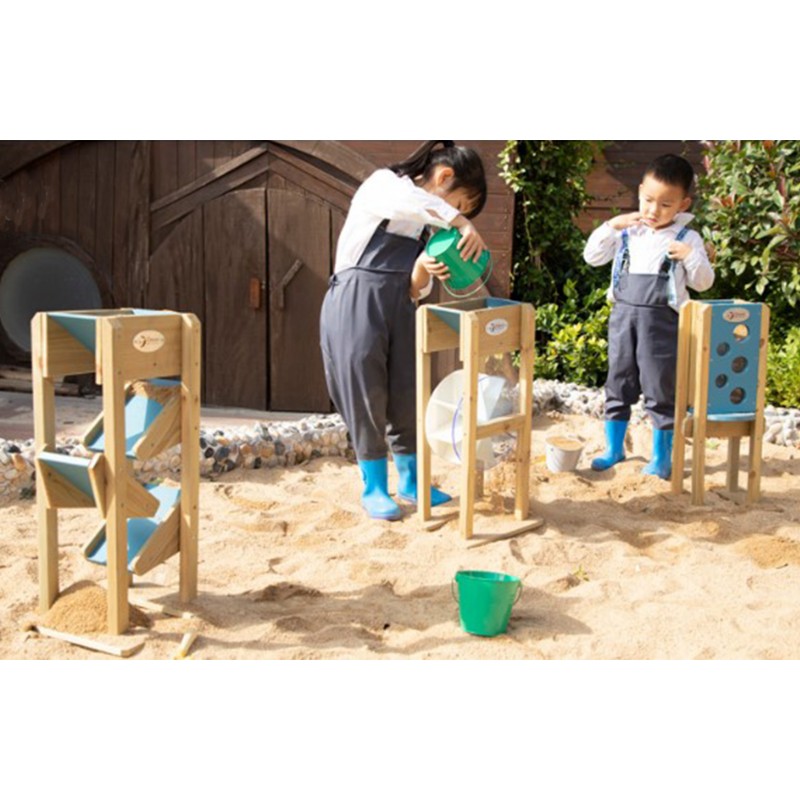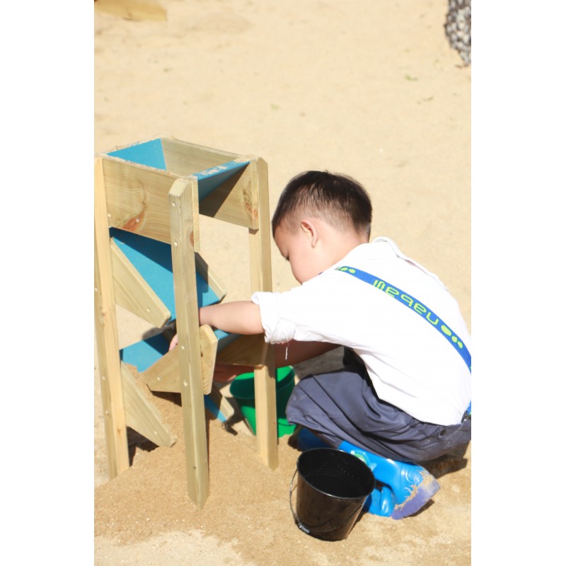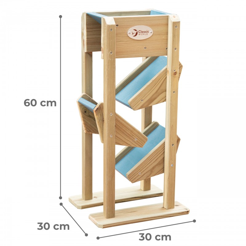 Drewniana zjeżdżalnia do piasku z rynnami to wyjątkowa, edukacyjna zabawka, która wspaniale uatrakcyjni każdą piaskownicę, przydomowy ogród czy przedszkolny plac zabaw. Konstrukcja opiera się na górnym lejku, do którego dzieci wsypują piasek, by następnie z fascynacją obserwować, jak swobodnie przesypuje się on w dół po trzech małych zjeżdżalniach. To niezwykle wciągająca zabawa sensoryczna, która naturalnie stymuluje ciekawość i angażuje zmysły malucha na świeżym powietrzu. Jej stabilna konstrukcja i przemyślany design sprawiają, że produkt jest trwałym, inspirującym dopełnieniem zewnętrznych stref zabaw, zachęcającym dzieci do długich, kreatywnych aktywności.