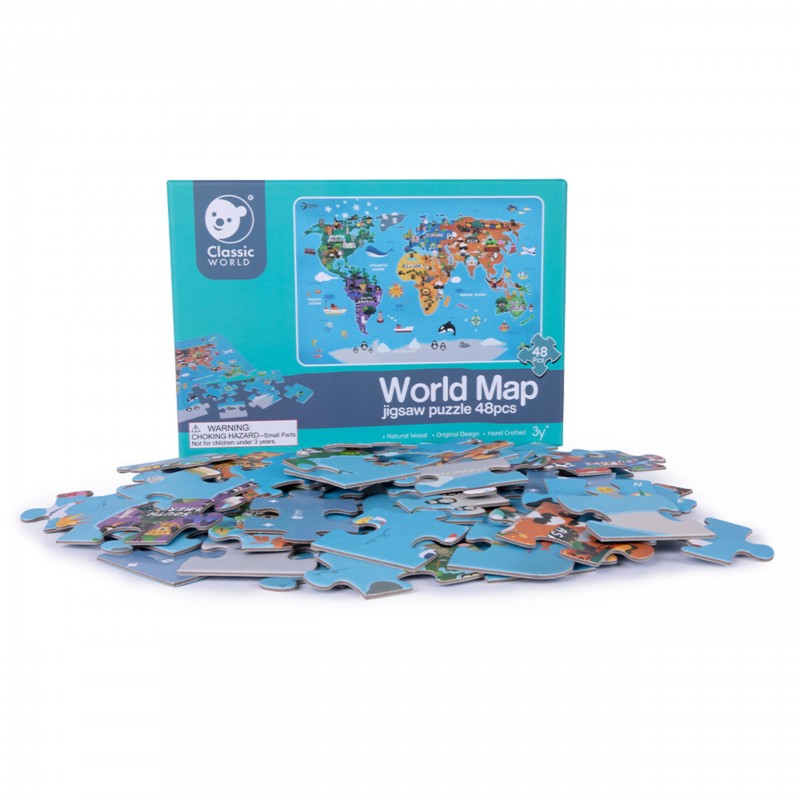 Zabierz swoje dziecko w fascynującą podróż dookoła świata. Drewniane puzzle Mapa Świata od CLASSIC WORLD to edukacyjna zabawka, która wciągnie każdego małego odkrywcę na długie godziny. Zestaw składa się z 48 elementów z żywymi, szczegółowymi ilustracjami, które układają się w kolorową mapę kontynentów. Podczas dopasowywania kolejnych fragmentów maluch rozwija swoją wyobraźnię, zdolności manualne oraz poznawcze. To świetny sposób na naukę przez zabawę a dzięki wysokiej jakości wykonania i bezpiecznym materiałom, rodzice mogą być spokojni o bezpieczeństwo dziecka.