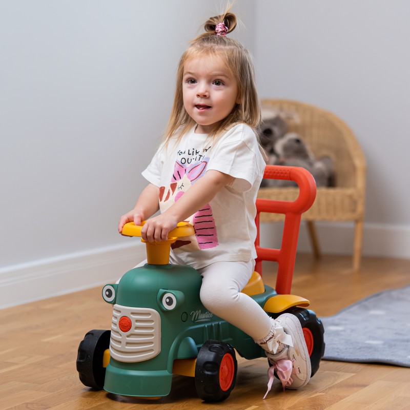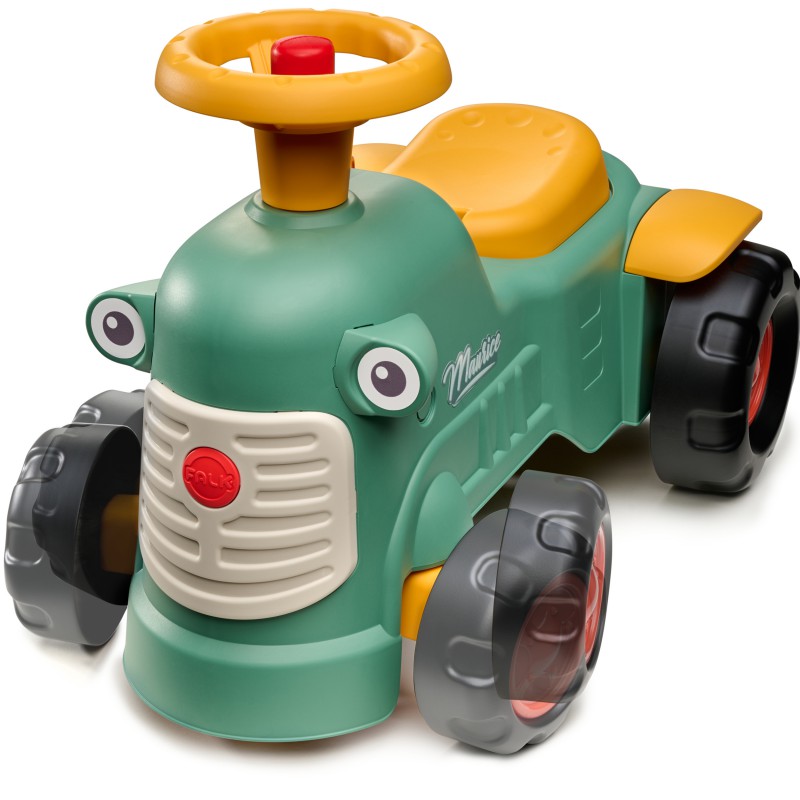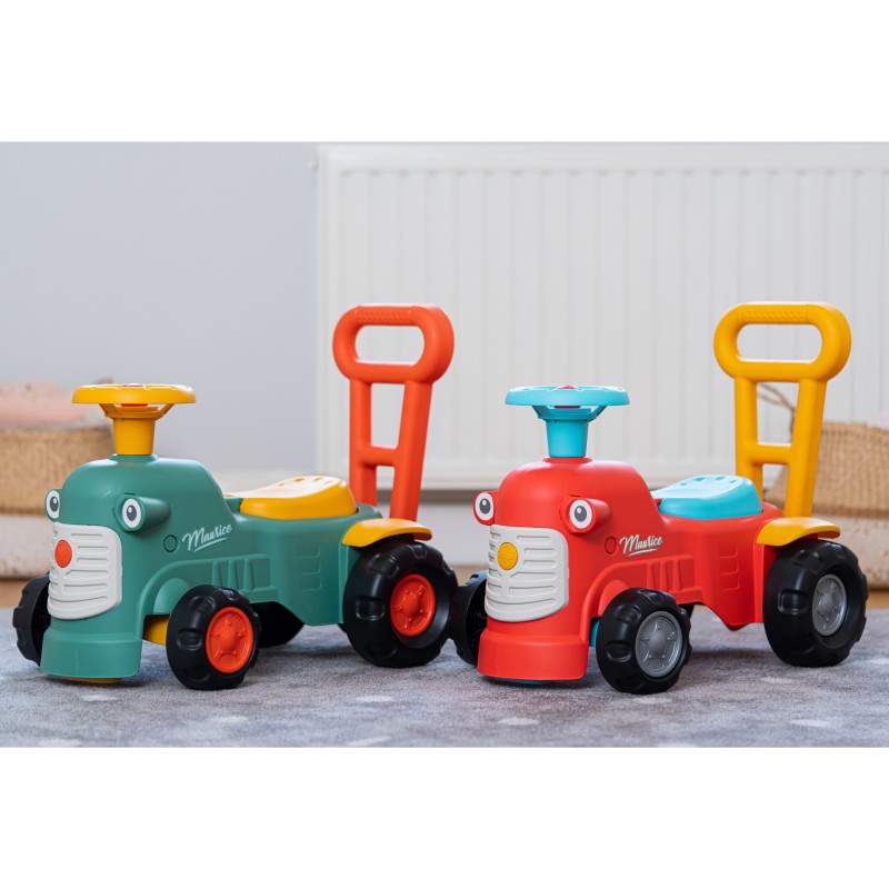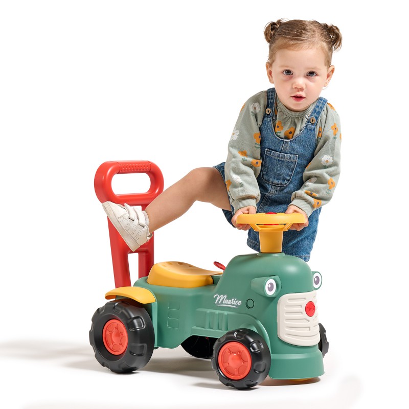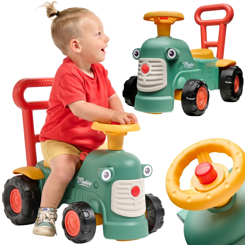 Uroczy i pełen pomysłowości jeździk traktorek Maurice to idealny towarzysz dla dzieci od 12 miesięcy aż do ich pierwszych kroków. Dzięki specjalnej ergonomicznej rączce pomaga maluchom w nauce chodzenia i stawianiu pewnych kroków. Ten wyjątkowy pojazd został wyprodukowany we Francji z wykorzystaniem co najmniej 90% plastiku pochodzącego z recyklingu. Posiada kierownicę z klaksonem, otwieraną skrytkę na skarby, dźwiękowy kluczyk oraz skrętne koła, co gwarantuje mnóstwo angażującej zabawy każdego dnia. Zabawka jest w pełni bezpieczna dla najmłodszych, ponieważ nie zawiera szkodliwych substancji takich jak BPA, ftalany ani PVC.