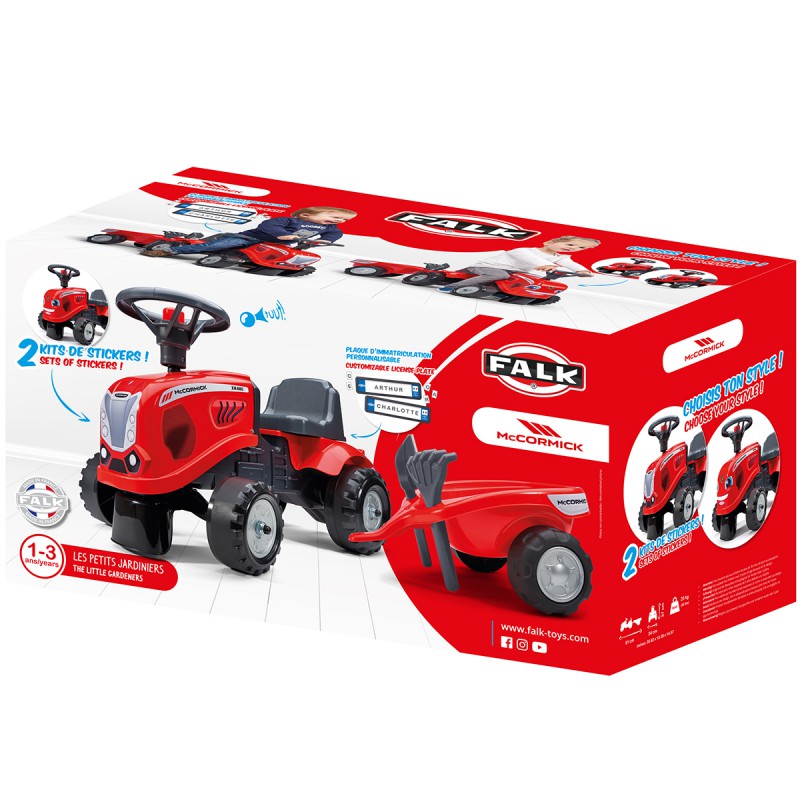 Traktorek Jeździk Baby Mac Cormick z przyczepką marki Falk to spełnienie marzeń niejednego małego traktorzysty. Starannie wykonany, z dbałością o najmniejszy szczegół! Żaden prawdziwy Farmer by takim nie pogardził. Pojazd wykonany z najwyższej jakości tworzywa przeznaczony dla dzieci od 12 miesiąca życia. Pojazd jest wyposażony odpinaną przyczepę z panelami oraz kierownicę z klaksonem. Koła traktorka zostały wykonane z wysokiej jakości plastiku. Dodatkowo do traktorka mamy do zabawy dla naszej pociechy grabki oraz łopatkę. Dołączone do traktorka naklejki pozwolą dziecku wybrać swój unikatowy styl. Uśmiechnięta buźka czy standardowa naklejka? Zaskocz wszystkich i naklej na przód pojazdu.