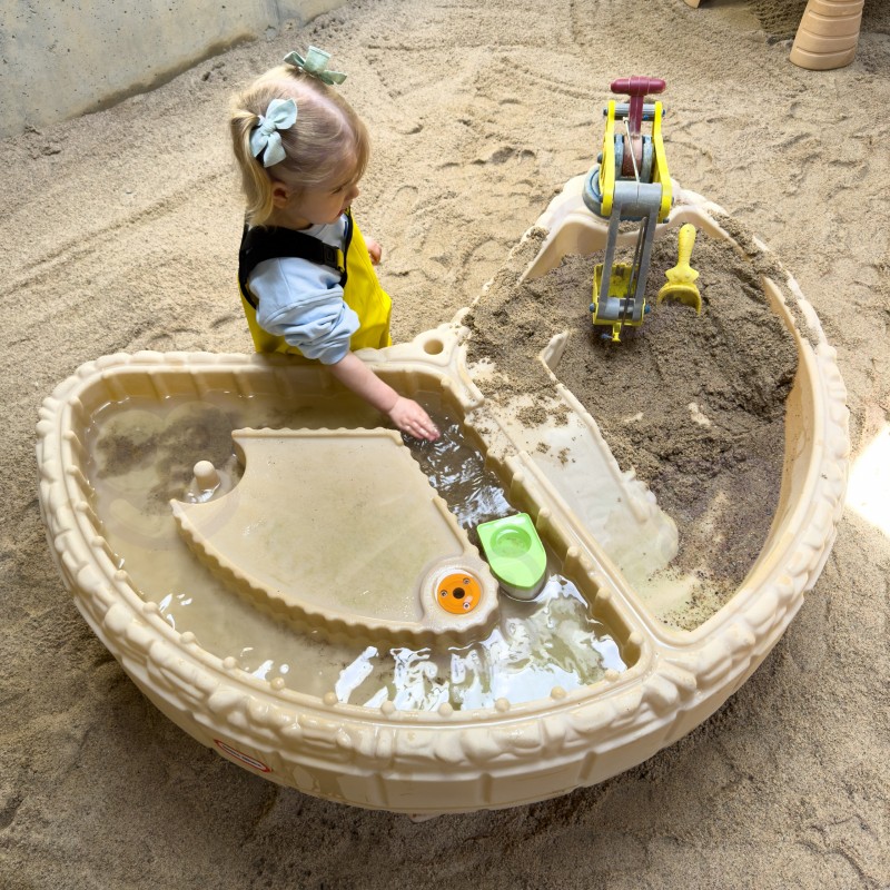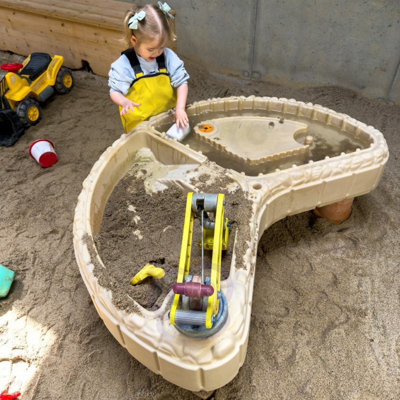 Piaskownica Plac Budowy z Parasolem od renomowanej marki Little Tikes będzie idealnym dopełnieniem twojego przydomowego ogródka. Piaskownica została wyposażona w specjalną, łatwą w obsłudze koparkę, dzięki której twoje dziecko załaduje piasek na wywrotkę czy do wiaderka. Druga część posiada kanał wodny z wyspą oraz most łączący wyspę z placem budowy i dźwigiem. W zestawie znajduje się parasol, który osłoni maluchy przed ostrym słońcem i dwa autka budowlane do wspaniałej zabawy.