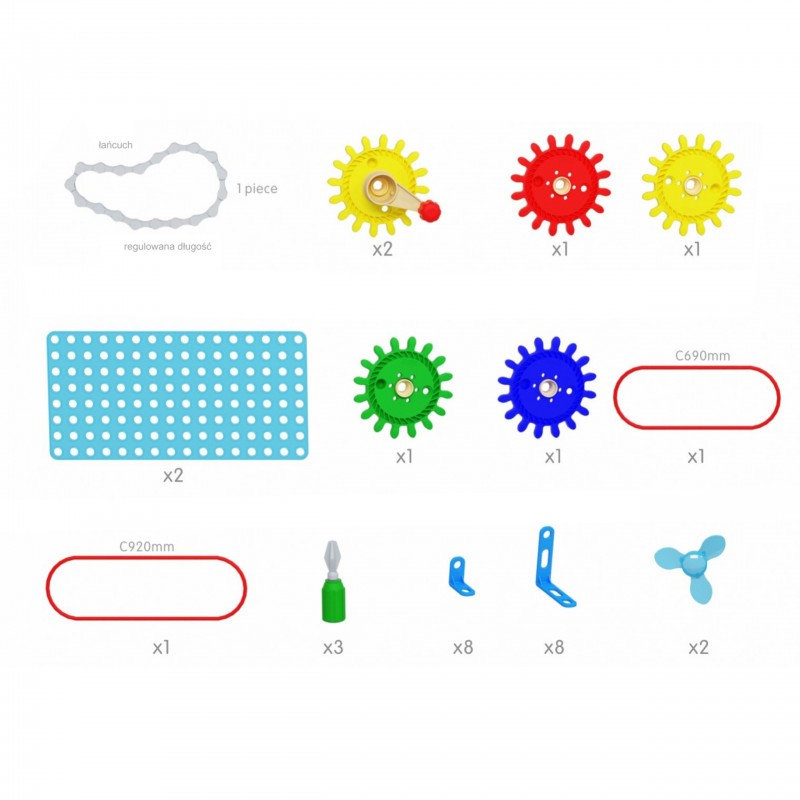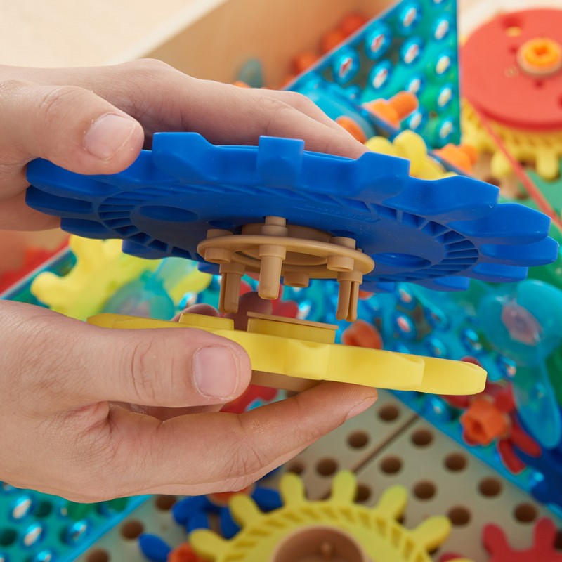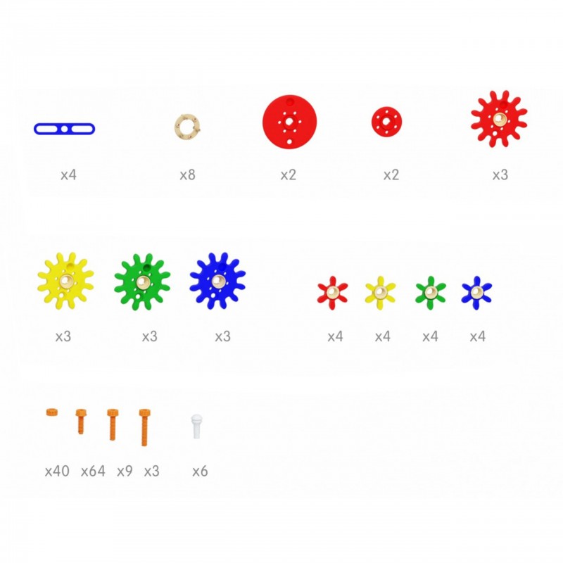Zestaw kolorowych trybików i kół zębatych, które pozwalają na skonstruowanie skomplikowanych mechanizmów. Zabawkę montuje się na Tablicy Naukowo-Kreatywnej Masterkidz STEM przy pomocy specjalnych śrub Masterkidz. Zabawa kołami zębatymi poprawia motorykę dziecka, zdolność logicznego myślenia, a także kreatywność.