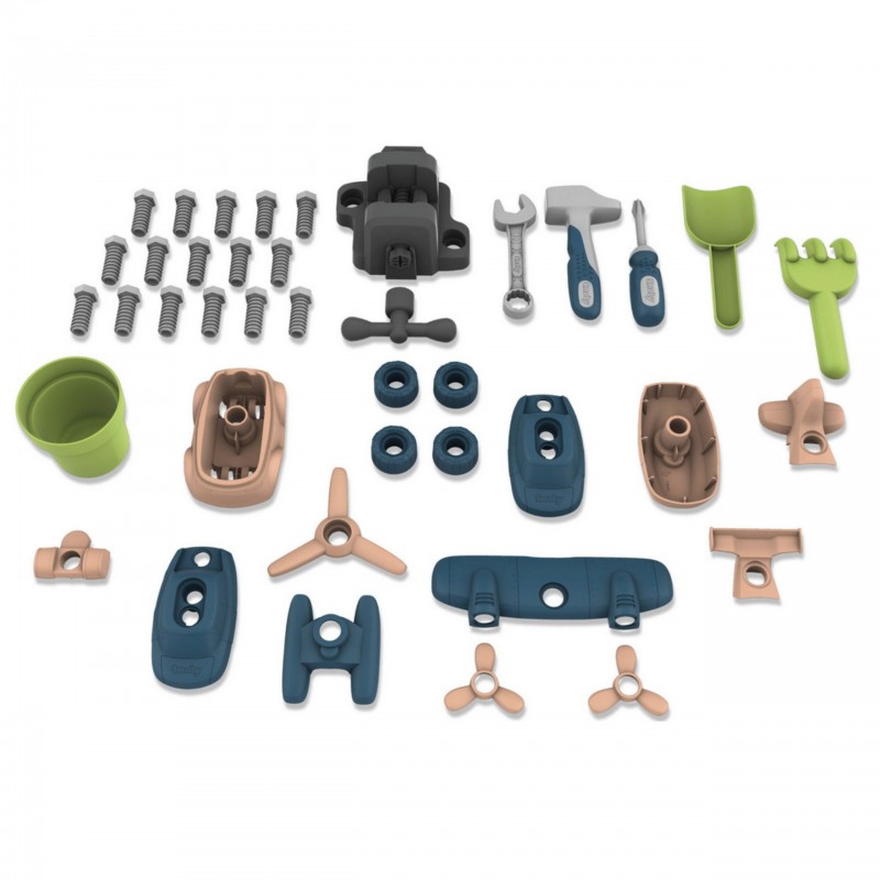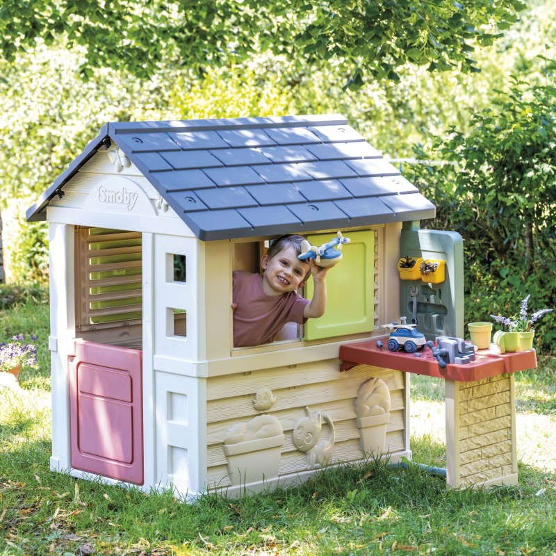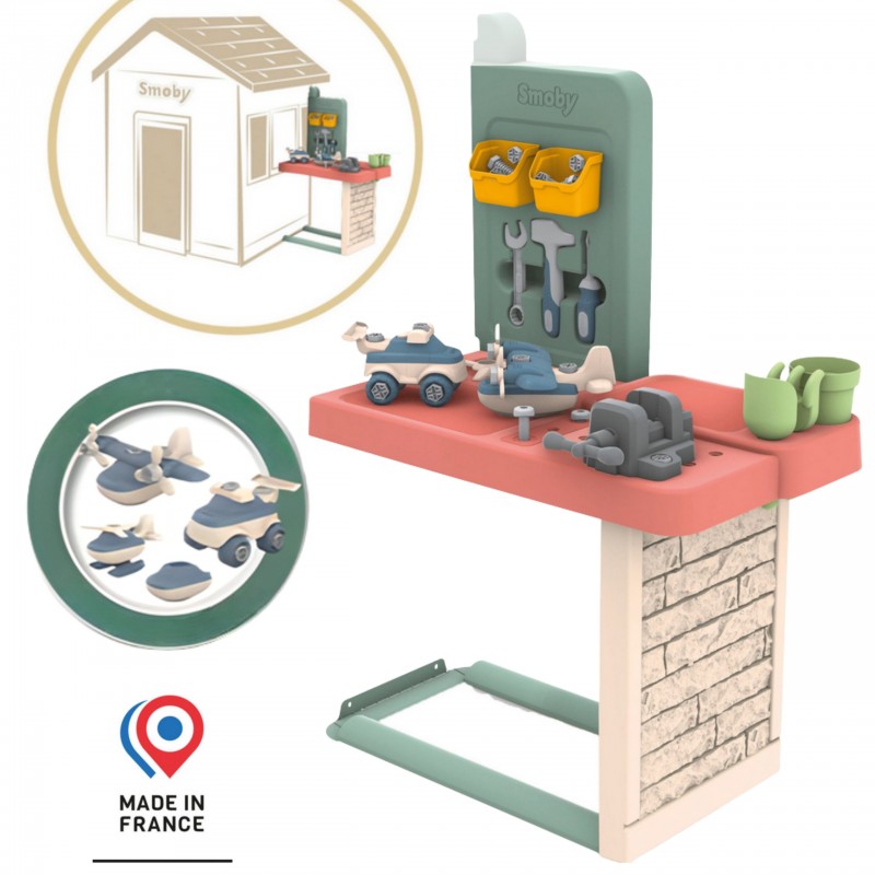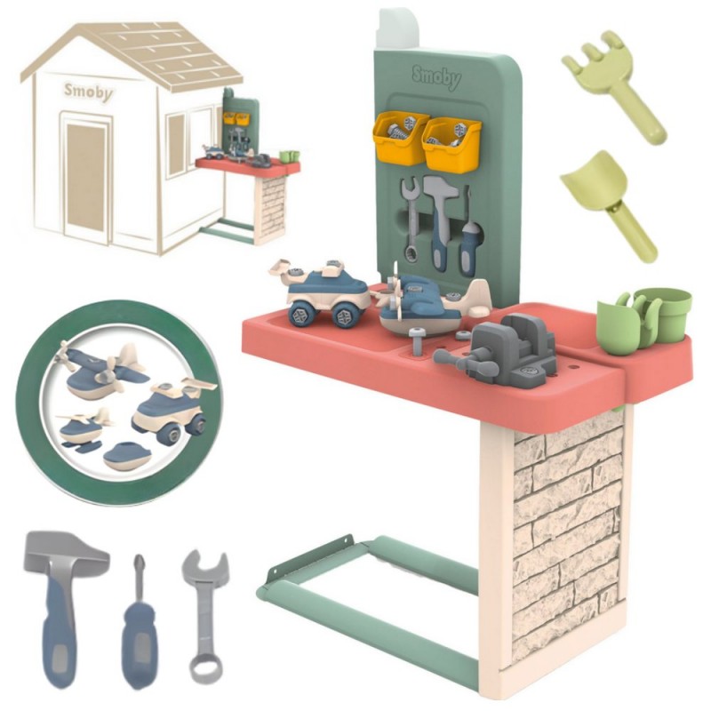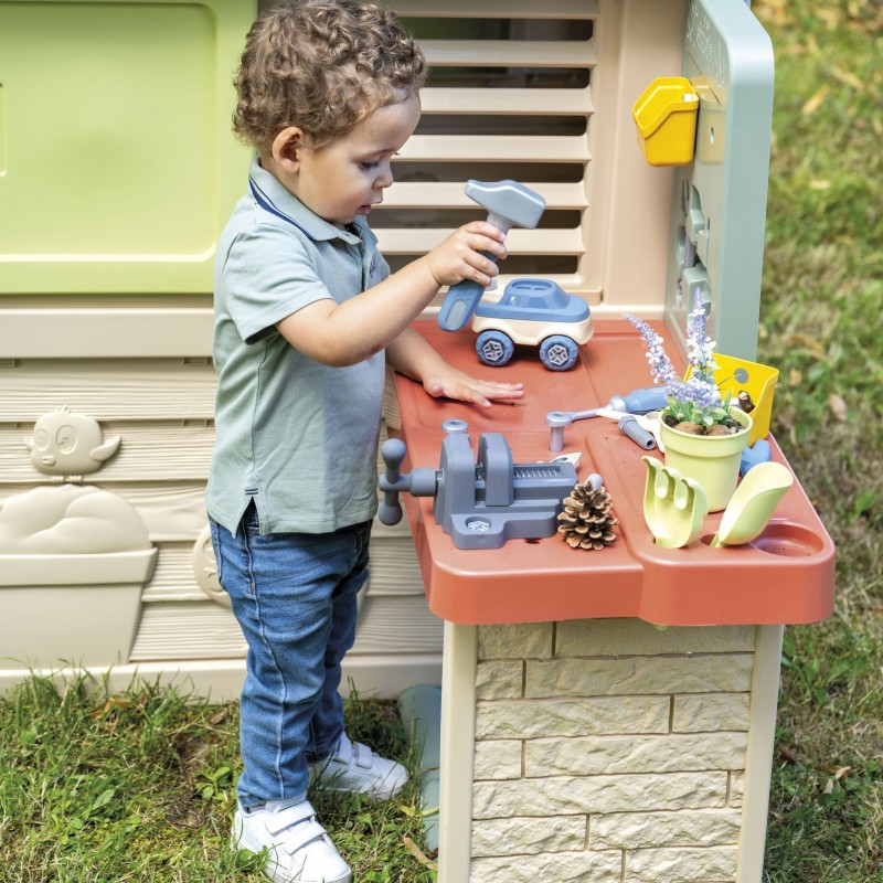 Stół roboczy z akcesoriami do domku Smoby Life – dla wszystkich, którzy chcą przekształcić swój dom zabaw Smoby w warsztat ogrodowy. Dzieci od 2. roku życia mogą śmiało „majsterkować”, uczyć się nowych umiejętności manualnych i bawić się, a dzięki 39 elementom narzędziowym, takim jak młotek czy śrubokręt. Przestronna powierzchnia robocza oraz półki sprawiają, że porządek i organizacja narzędzi stają się łatwe i przyjemne. W zestawie znajdują się także zabawki do składania jak auto i helikopter, które dodatkowo pobudzają kreatywność i planowanie. Solidna, UV odporna konstrukcja z dużą zawartością materiałów po recyklingu gwarantuje trwałość i świetną zabawę na świeżym powietrzu przez wiele sezonów!