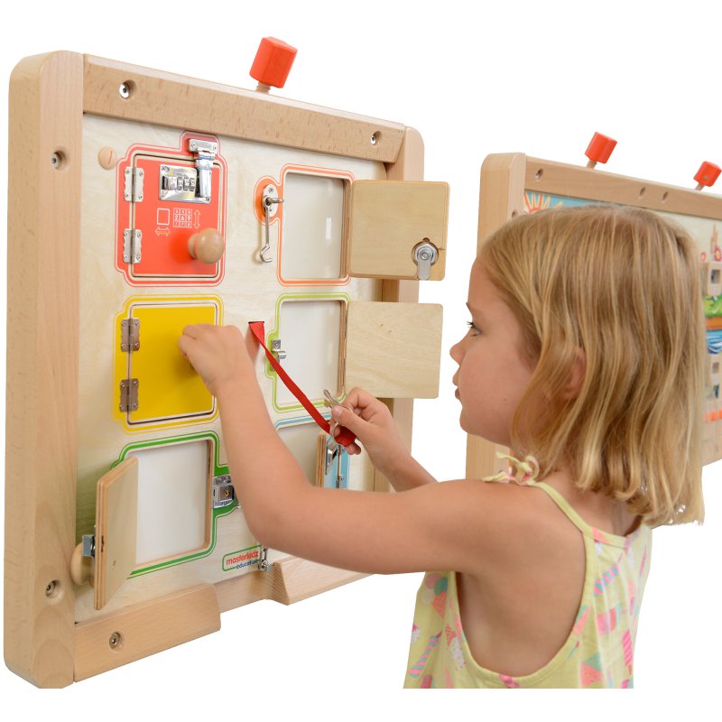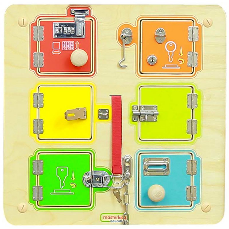 Fantastyczna tablica ścienna dla dzieci, której celem jest nauczenie maluchów zamykania i otwierania zamków, jakie mogą spotkać przy drzwiach. Tablica składa się z drewnianej płyty, oraz 6 mini-sejfów, na których można ćwiczyć. Zamykane są różnymi rodzajami zamków, więc gra jest wciągająca i nie nudzi się zbyt szybko.