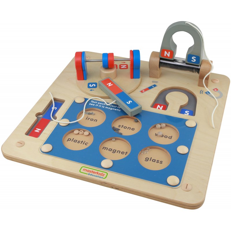 Edukacyjna tablica marki Masterkidz wyposażona jest w pojemniczki z różnymi materiałami, oraz magnesy, którymi można sprawdzać, które materiały zostaną przyciągnięte, a które nie. Eksperymentując, dziecko może nauczyć się co przyciąga magnes.