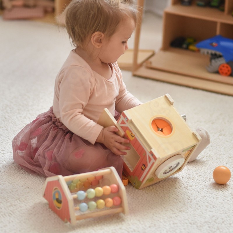 Drewniana stodoła aktywności marki Tooky Toy, to drewniany sorter w kształcie stodoły, który kryje w sobie mnóstwo niespodzianek! Ten czarujący drewniany sorter w kształcie stodoły to idealna propozycja dla najmłodszych odkrywców. Otwierane drzwiczki, ruchome elementy, kolorowe liczydło umieszczone na dachu oraz urocze figurki zwierzątek – każda strona zabawki to nowa przygoda, która angażuje dziecko i zachęca do aktywnej zabawy. Dzięki przemyślanej konstrukcji łączącej różnorodne aktywności, ta drewniana stodoła zapewnia wielogodzinną, wartościową rozrywkę, która wspiera rozwój Twojego malucha na wielu płaszczyznach.