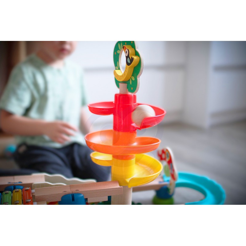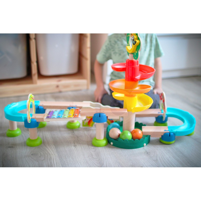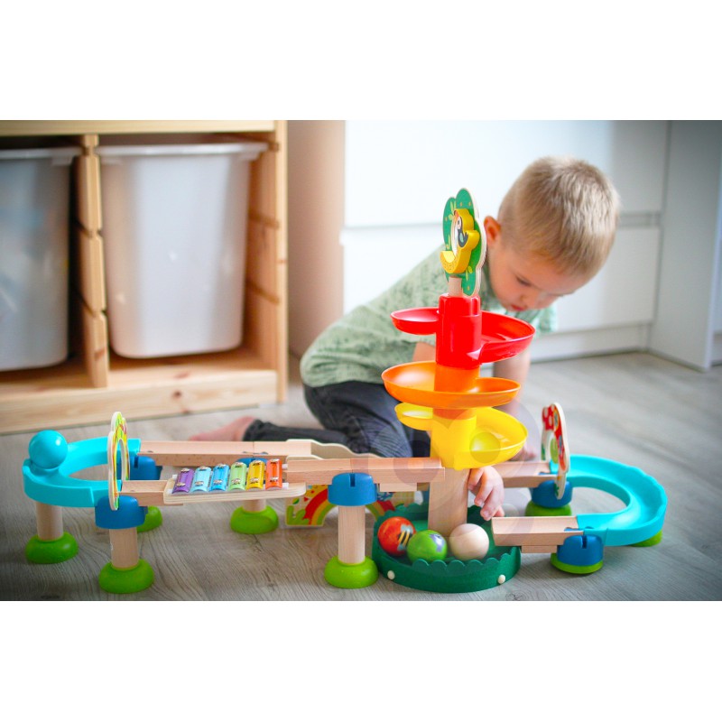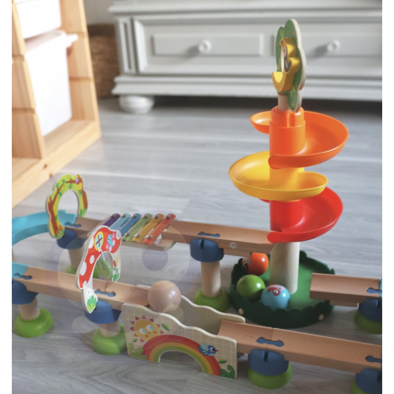Drewniany tor kulkowy Tooky Toy ze zjeżdżalnią w kształcie drzewa i działającym ksylofonem całkowicie pochłonie dzieci! Zestaw zawiera 44 części i zabawne elementy, dzięki którym dzieci każdego dnia budują inny tor z piłeczkami. Piłka toczy się po torze saneczkowym w kształcie drzewa, gra na ksylofonie, przechodzi pod łukami, przeskakuje stopnie i uderza w podstawę drzewa. Tor saneczkowy w kształcie drzewa może być również używany osobno jako tor do piłek dla najmłodszych! Podczas zabawy dzieci rozwijają również swoją kreatywność i wyobraźnię, doskonalą motorykę małą czy poznają podstawowe zasady fizyki. Ponadto budowanie i obserwowanie piłki będzie dla nich prawdziwą frajdą. Piłki są duże i bezpieczne!