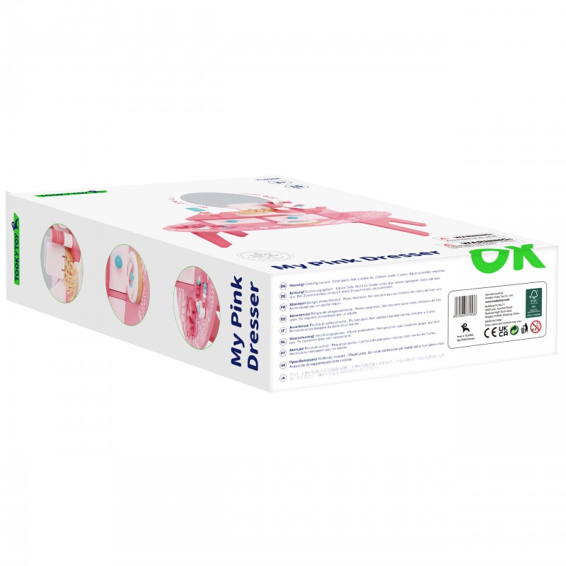 Piękna różowa toaletka od Tooky Toy to wymarzony mebel w pokoju każdej dziewczynki. Toaletka posiada dwie wysuwane szuflady, w które mała księżniczka może schować swoje skarby. Do zestawu dołączone są jeszcze liczne akcesoria. Całość wykonana z drewna i pomalowana nietoksycznymi farbami bezpiecznymi dla dzieci i środowiska.