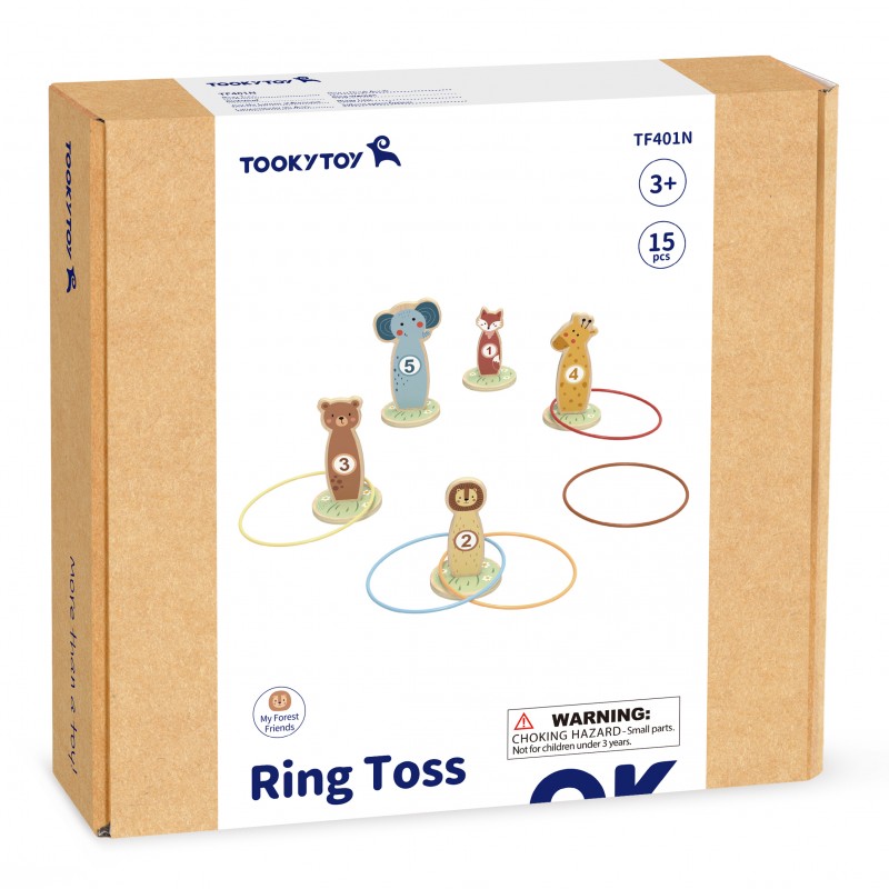 Rzut do celu obręczami marki Tooky Toy to gra zręcznościowa, która dostarcza wielu godzin świetnej zabawy, jednocześnie rozwijając koordynację wzrokowo-ruchową. W zestawie znajduje się 5 postaci zwierząt umieszczonych na podstawkach - tygrys, niedźwiedź, lew, słoń i żyrafa oraz 5 pierścieni. Drewniane elementy można układać w dowolnej konfiguracji, w miarę postępów zwiększać poziom trudności , umieszczając kółka dalej, co pozwala na kreatywne projektowanie własnej wersji gry. Gra doskonała do wspólnej zabawy z przyjaciółmi i rodziną, zachęca dzieci do interakcji społecznych.