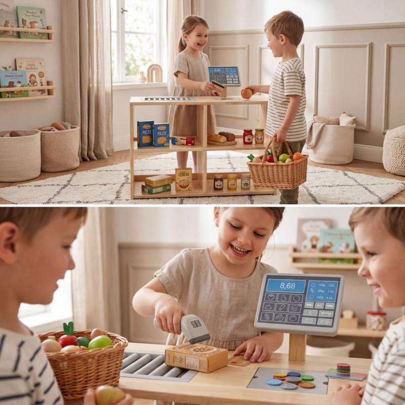 Drewniana Kasa Sklepowa od marki VIGA to idealne wyposażenie dla małych sprzedawców, które wzbogaci zabawę w sklep i odgrywanie ról. Wykonana z wysokiej jakości drewna, pomalowana nietoksycznymi farbami. Wyposażona w realistyczne elementy, takie jak atrapa kasy sklepowej z ekranem dotykowym, czytnik kodów kreskowych oraz rolki imitujące taśmę sklepową.