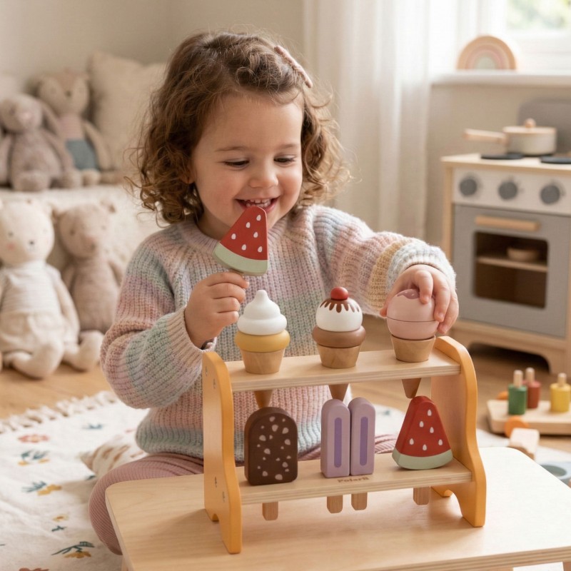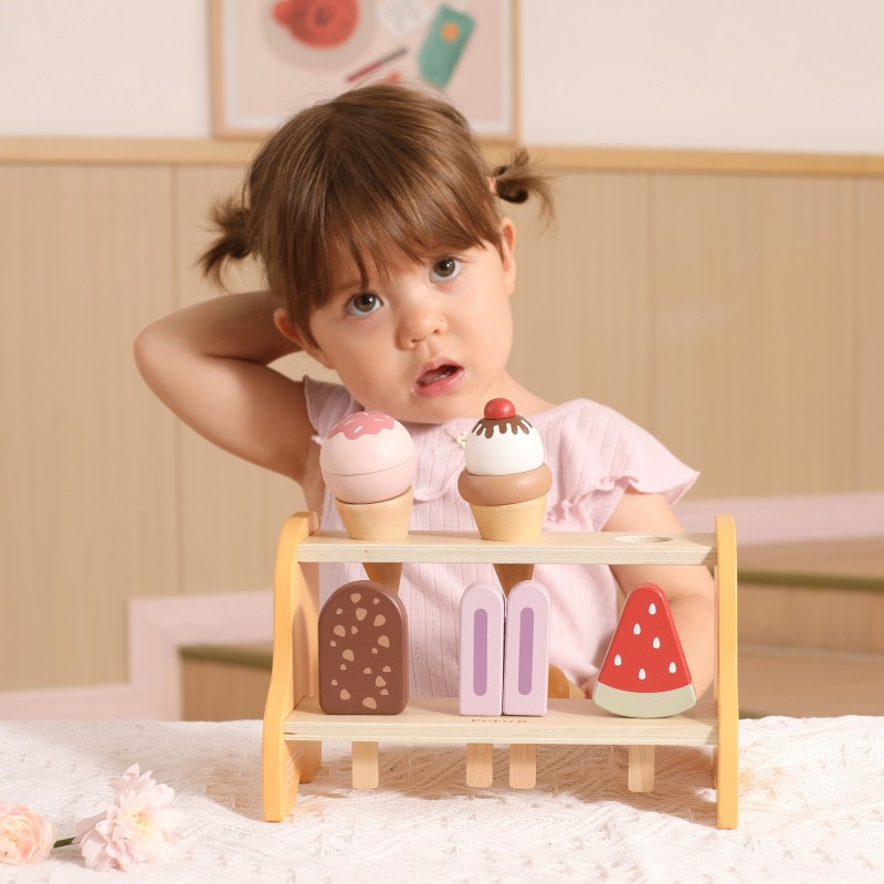 Ten uroczy zestaw zawiera 6 kolorowych lodów od marki VIGA– 3 rożki i 3 lody na patyku – ozdobione kultowymi wzorami, które zachwycą każde dziecko. Dwuwarstwowy, drewniany stojak pozwala eksponować lody i utrzymać porządek podczas zabawy. Wyjmowane elementy stymulują małą motorykę i rozwijają zabawę dotykową. Idealny do kreatywnego odgrywania ról – np. własnego straganu z lodami!