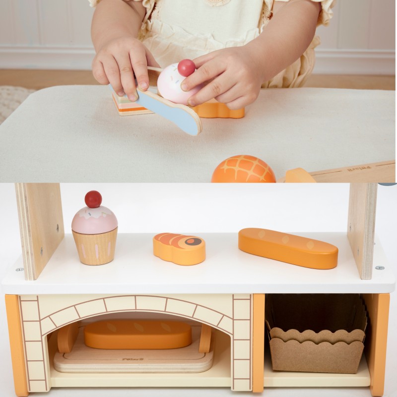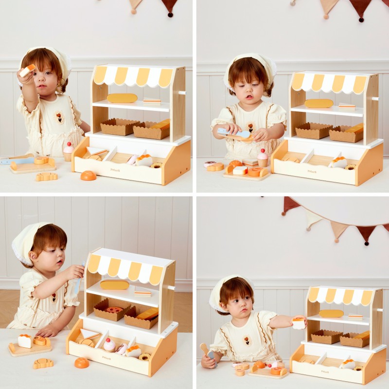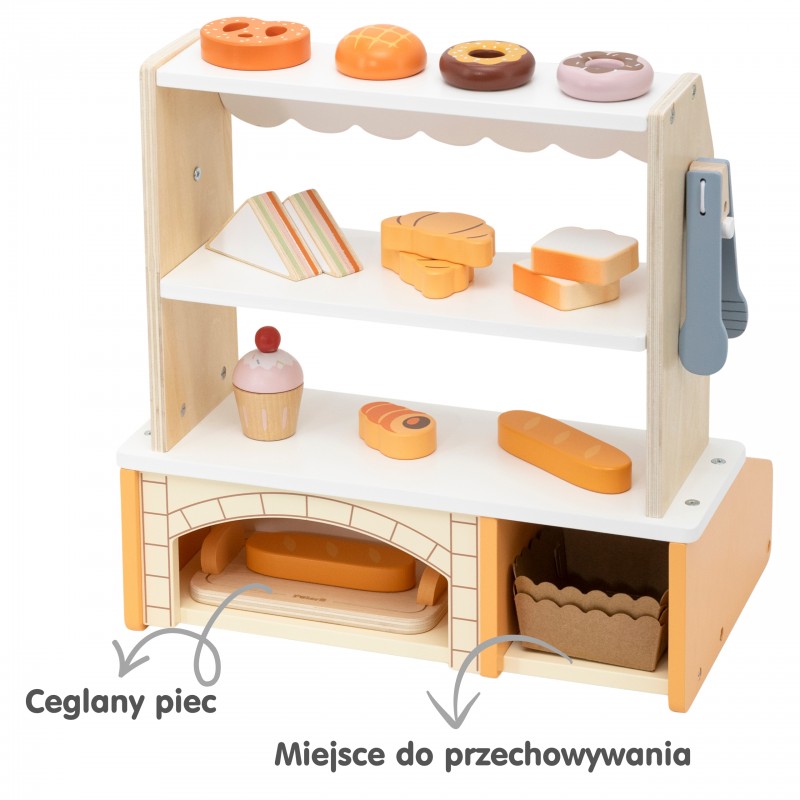 Ta urocza, drewniana Mini Piekarnia marki VIGA to idealna zabawka do odgrywania ról! Zestaw zawiera realistyczny stojak/stragan z daszkiem w paski oraz 16 sztuk drewnianych akcesoriów imitujących pyszne wypieki. Dzieci mogą wcielić się w rolę prawdziwego piekarza lub sprzedawcy, serwując klientom rogaliki, pączki, tosty, babeczki i wiele innych smakołyków. Stojak wyposażony jest w dwie półki ekspozycyjne, specjalne miejsce na chleb (imitacja ceglanego pieca) i szczypce do nakładania, co dodaje zabawie autentyczności. Subtelna, pastelowa kolorystyka (naturalne drewno, biel i odcienie pomarańczu/żółci) sprawia, że piekarnia pięknie prezentuje się w każdym dziecięcym pokoju. Zabawa w piekarnię doskonale rozwija kreatywność i umiejętności społeczne poprzez interakcje oraz wspiera rozwój ruchowy dzięki manipulowaniu małymi elementami i szczypcami. Wysoka jakość i trwałość drewnianej konstrukcji gwarantują długie godziny bezpiecznej i rozwijającej zabawy. Daj swojemu dziecku szansę na prowadzenie własnego małego biznesu z VIGA!
