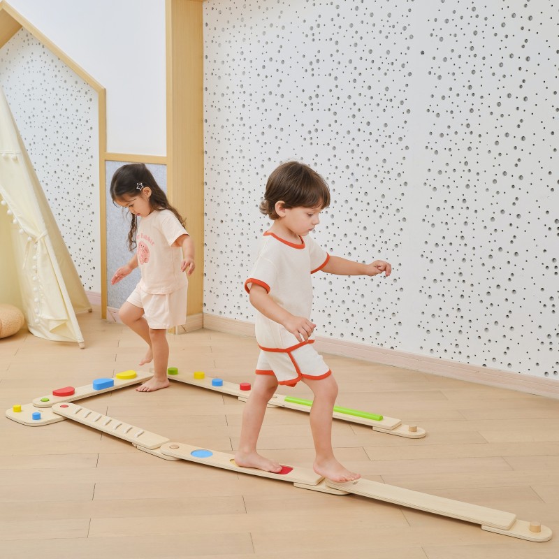 Odkryj i rozwijaj świat zmysłów dzięki innowacyjnemu zestawowi sensorycznych belek równoważnych od marki Viga. Ta wyjątkowa zabawka, składająca się z 6 belek i 1 łącznika, pozwala dziecku na swobodne tworzenie własnych, unikalnych torów i ścieżek równowagi. Każda belka zawiera zróżnicowane przeszkody, które dostarczają różnorodnych bodźców dotykowych, wspierając tym samym rozwój koordynacji, kreatywności i pewności siebie Twojego malucha. Zestaw zawiera zarówno belki z łatwiejszymi, jak i trudniejszymi przeszkodami, co pozwala na dostosowanie poziomu trudności do umiejętności dziecka. Łączniki są zintegrowane z belkami, co znacznie ułatwia montaż i przechowywanie zabawki. To idealne narzędzie do rozwoju dużej motoryki i świadomości ciała w przestrzeni, które zapewnia bezpieczną i pełną wrażeń zabawę.