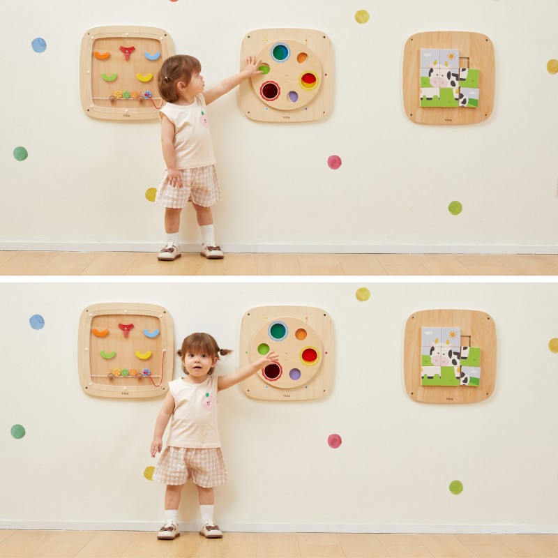 Odkryj niezwykłą zabawę, która rozwija zmysły i umiejętności Twojego dziecka! Tablica ścienna z układanką od marki Viga to idealne rozwiązanie do pokoju malucha. Ta kreatywna zabawka została zaprojektowana, by rozwijać koordynację wzrokowo-ruchową oraz precyzję ruchów. Dzięki niej, Twoje dziecko może przesuwać obrazkowe puzzle, tworząc obrazek uroczej krówki. Układanka wymaga od malucha trzymania górnego elementu, by móc przesunąć dolny, co doskonale ćwiczy koordynację dłoni i świadomość przestrzenną. To nie tylko doskonała rozrywka, ale również sposób na wspieranie umiejętności rozwiązywania problemów podczas zabawy. Zabawka jest łatwa w montażu na ścianie, dzięki czemu nie zajmuje cennego miejsca na podłodze.