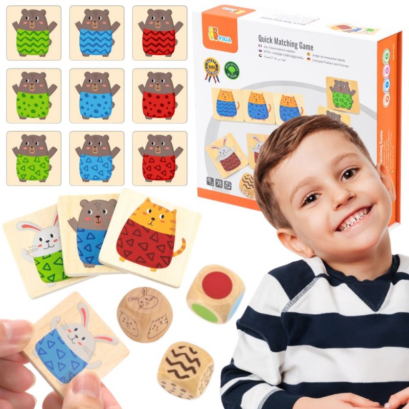 Drewniana gra szybkiego odgadywania marki VIGA to idealna gra towarzyska dla przyjaciół i rodziny. Zadaniem dziecka jest rzucić wybraną ilość kostek (od 1 do 3) i znaleźć odpowiednie zwierzę z odpowiednimi wzorami na koszulce oraz w odpowiednim kolorze. Całość wykonana jest z drewna i pomalowana nietoksycznymi farbami.