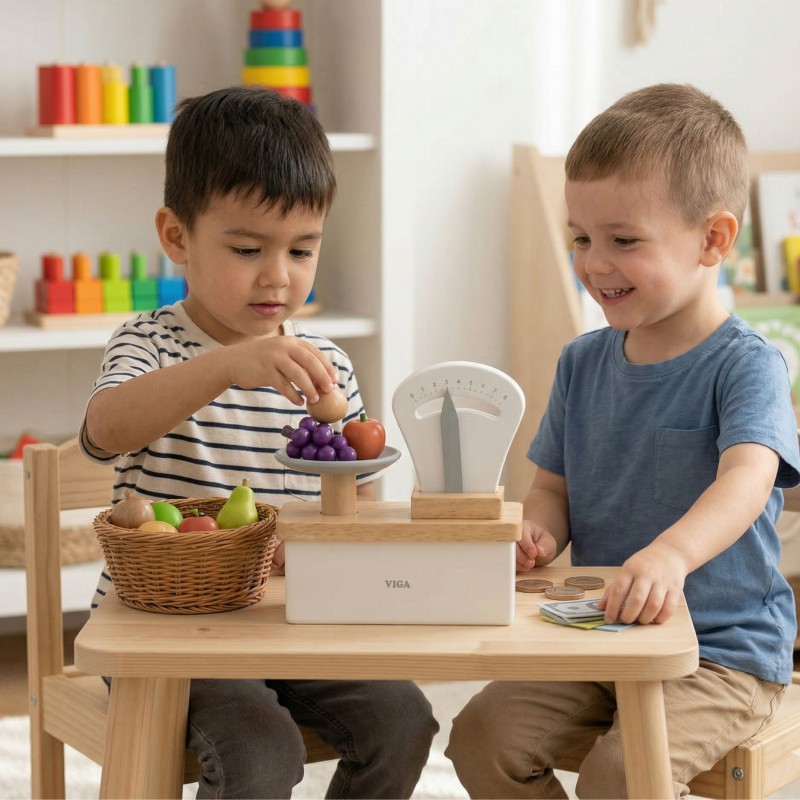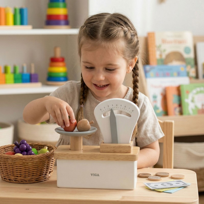 Drewniana Waga sklepowa od firmy Viga to jedna z czołowych zabawek, która pozwoli dziecku wejść do świata ciekawej i kreatywnej zabawy. Taka waga sklepowa wprowadzi Twoje dziecko w ekscytującą zabawę jako sprzedawca, jednocześnie pomoże kształtować precyzję ruchów rączek, oraz poprawić koordynację wzrokowo-ruchową. Taka waga sklepowa to niezbędny element zabawy w sklep, który pomoże zważyć owoce i warzywa. To zalety, których nie zastąpi żadna inna zabawka. Kolorowa waga rozwija wyobraźnię i fantazję, pomaga zrozumieć wartość pieniądza oraz podstawy matematyki i przedsiębiorstwa.