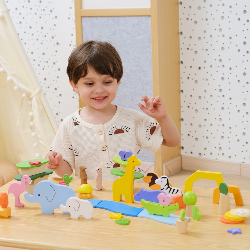 Przenieś swoje dziecko w świat afrykańskiej przygody z zestawem VIGA Kolorowe Klocki Opowieści Tropikalne! Ten niezwykle bogaty komplet, składający się z 55 drewnianych, luźnych elementów, to esencja swobodnej zabawy i nauki w duchu Montessori. Figurki zwierząt z sawanny – słonia, żyrafy, lwa i zebry – oraz elementy tropikalnej roślinności i rzeki, inspirują maluchy do tworzenia własnych scenariuszy i rozwijania kreatywności. Klocki wspierają małą motorykę i koncentrację, a dzięki wygodnemu, drewnianemu pudełku z przegródkami, sprzątanie jest równie łatwe jak zabawa.