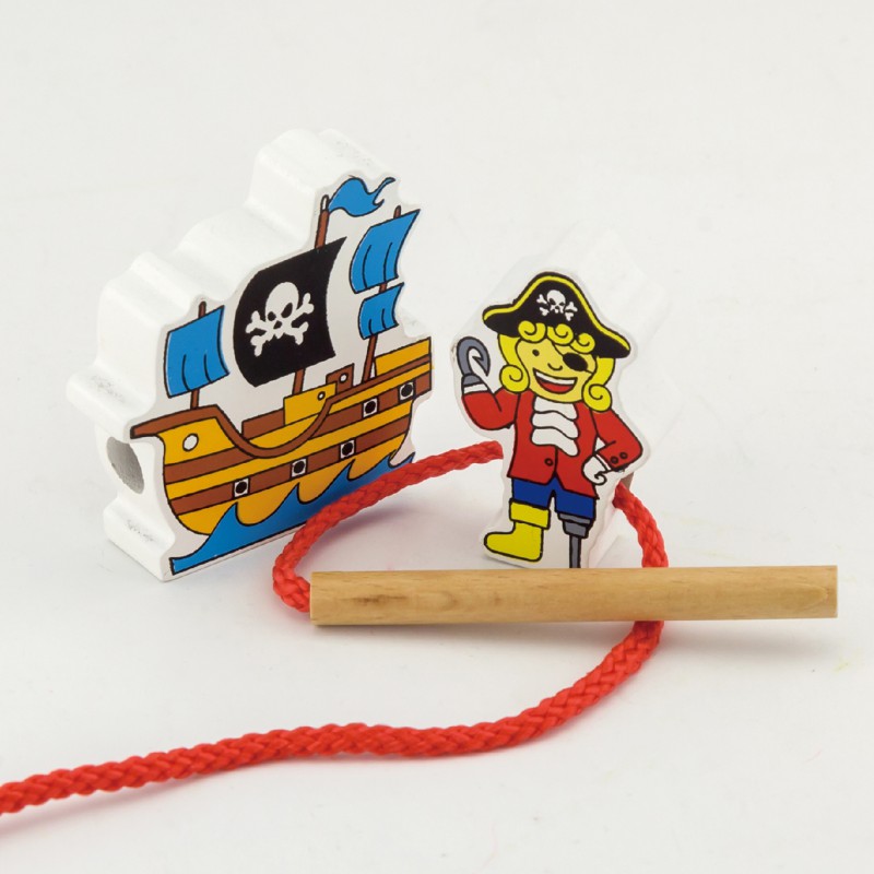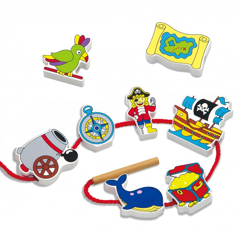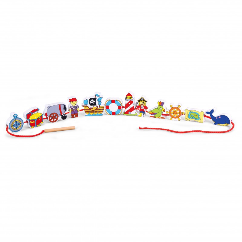 Piękne, kolorowe klocki do nawlekania zachęcają do zabawy. Każdy z 12 elementów został pomalowany dokładnie z obydwu stron. W zestawie znajduje się sznureczek z drewnianym kołeczkiem, który służy do nawlekania klocków w dowolnej kolejności. Klocki przedstawiają piratów, skarb, statek i papugę - wszystko, aby jak najszybciej wyruszyć na poszukiwania skarbu.