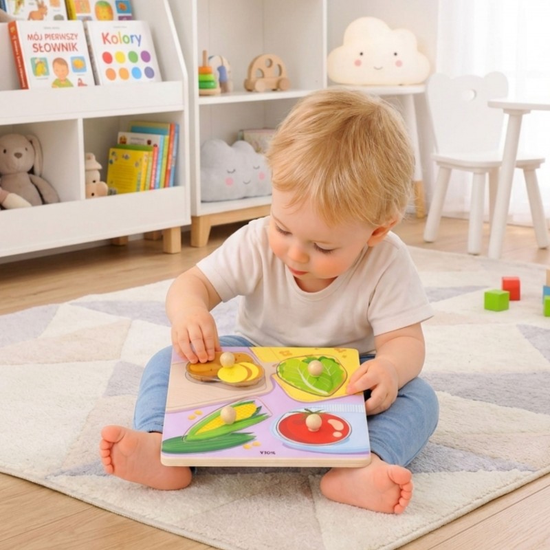 Prosta i trwała zabawka dedykowana dzieciom powyżej 12. miesiąca życia. Każdy element wyposażono w wygodny uchwyt, który pozwala maluchowi na samodzielne i sprawne chwytanie puzzli.Intensywne kolory i przyjazne grafiki przyciągają wzrok, skutecznie zachęcając dziecko do ćwiczeń manualnych.