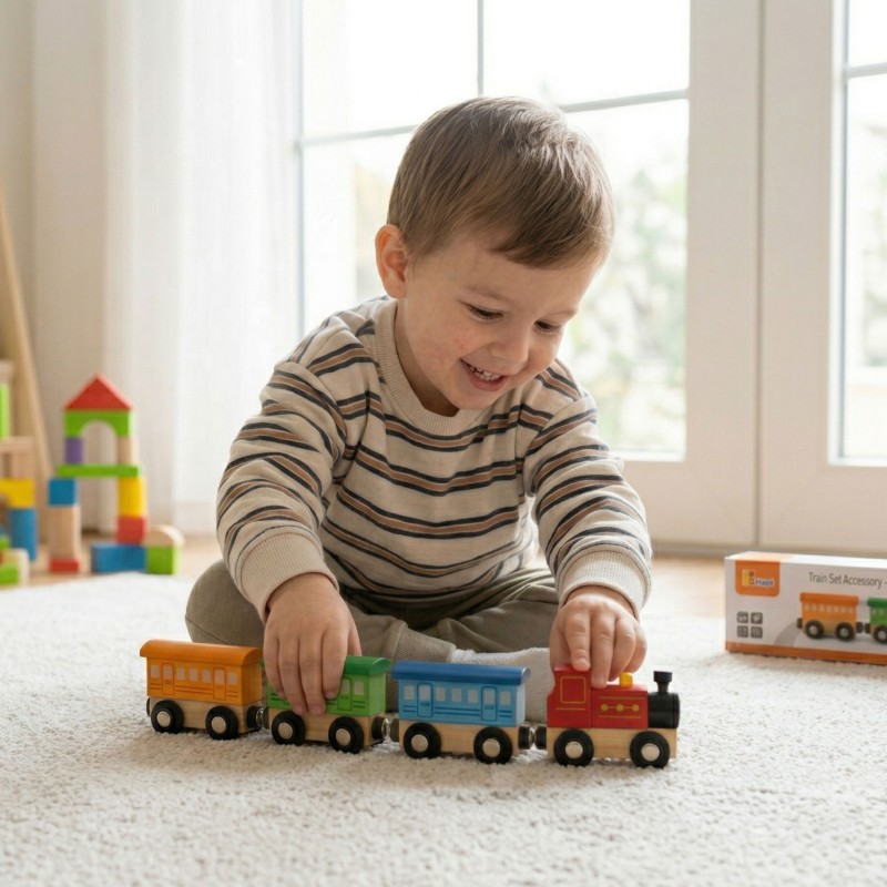 Zestaw kolejki to klasyczny pociąg, który zagwarantuje dziecku mnóstwo doskonałej zabawy. Składa się z 4 elementów połączonych magnesami. Komplet może być wykorzystywany jako samodzielna zabawka, ale sprawdzi się również idealnie jako uzupełnienie kolejki, innych zestawów czy klocków drewnianych.