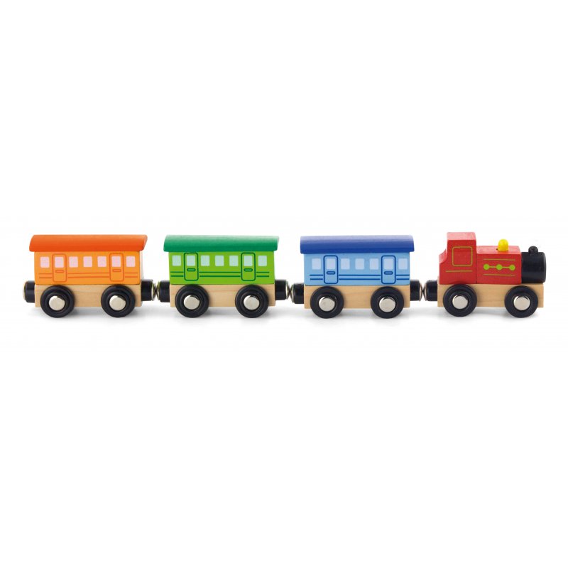 Zestaw kolejki to klasyczny pociąg, który zagwarantuje dziecku mnóstwo doskonałej zabawy. Składa się z 4 elementów połączonych magnesami. Komplet może być wykorzystywany jako samodzielna zabawka, ale sprawdzi się również idealnie jako uzupełnienie kolejki, innych zestawów czy klocków drewnianych.
