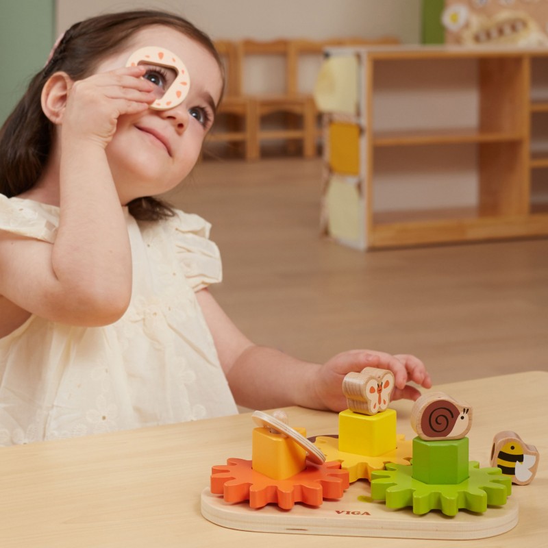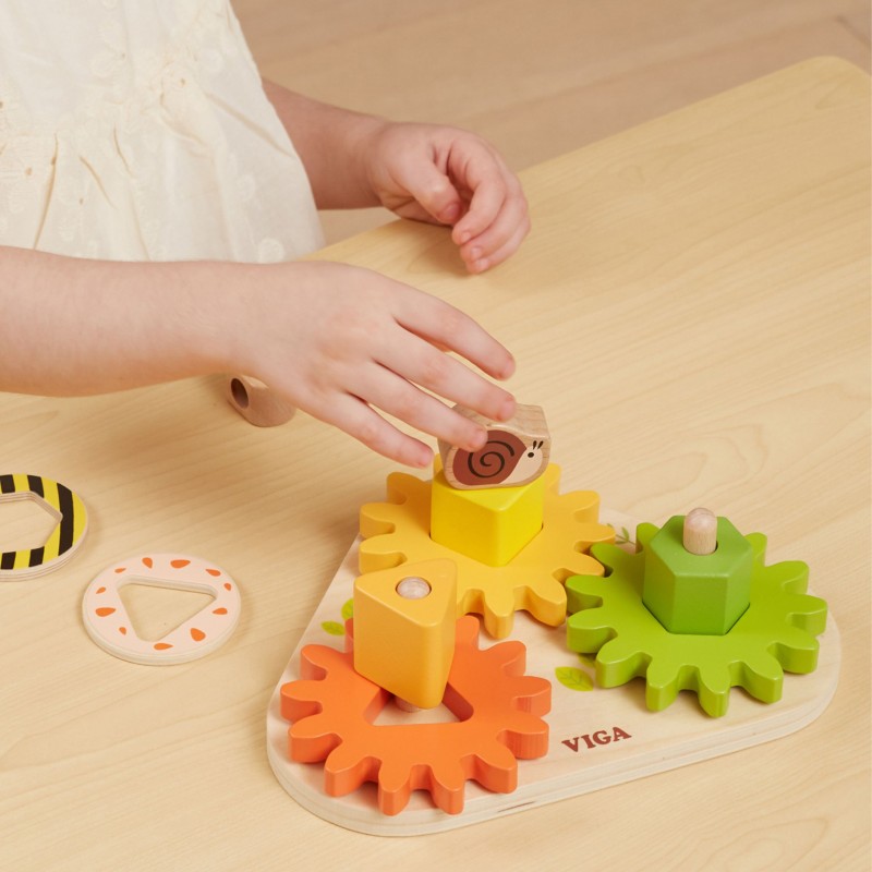 DREWNIANY SORTER "Kształty i Mechanizmy" od renomowanej marki Viga to doskonała zabawka edukacyjna dla dzieci, która łączy naukę z zabawą. Doskonale ćwiczy pamięć, spostrzegawczość oraz uczy rozpoznawania kolorów.Przyjemne dla oka kolory, przez długi czas będą cieszyć twoje dziecko podczas zabawy. Sortowanie klocków może być wyzwaniem, zwłaszcza dla najmłodszych. Dziecko uczy się cierpliwości i wytrwałości, próbując dopasować elementy - wymaga to precyzji i koordynacji ruchowej. To doskonałe ćwiczenie dla małych rączek. Zabawa może służyć jako sorter- dziecko samodzielnie układa elementy na kołeczkach, tworząc własne wyjątkowe konstrukcje. Dodatkowo zębatki są zaprojektowane w taki sposób, że obrót jednej powoduje ruch pozostałych. Zabawka pomoże w poznaniu podstawowych praw fizyki - działanie koła zębatego. Przy zakręceniu pierwszym kołem następuje wprawianie dalszych elementów w ruch i przekazywanie siły kolejnym zębatkom.