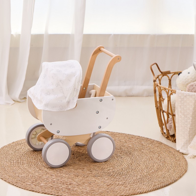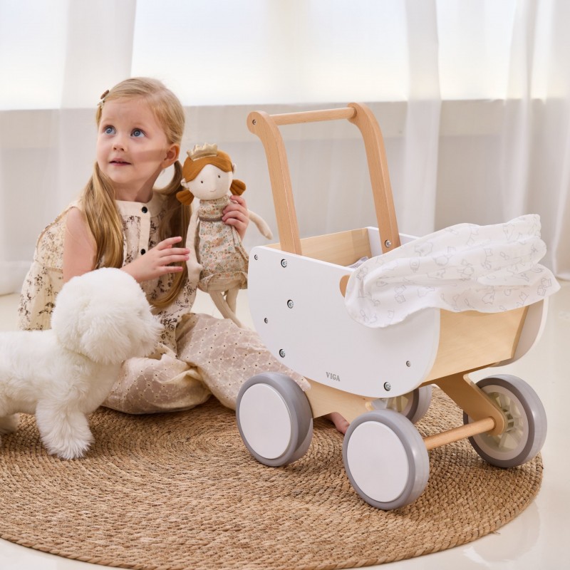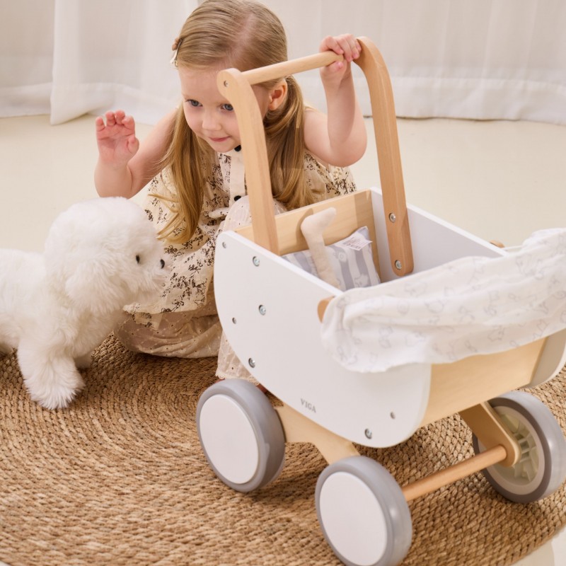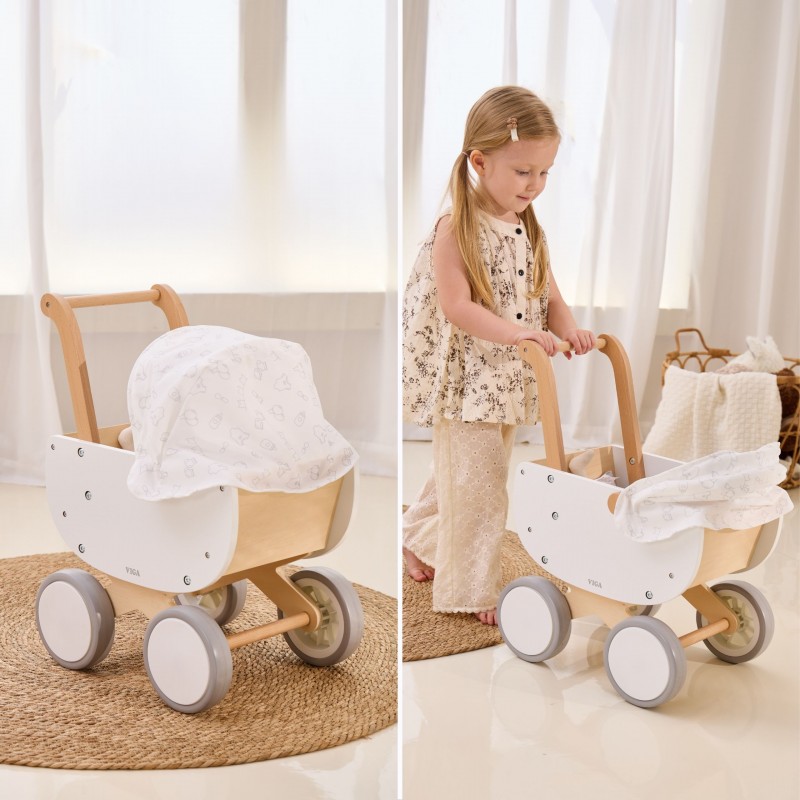 Uroczy drewniany wózek dla lalek z gondolą od marki Viga, to połączenie klasycznej formy z nowoczesnym stylem serii PolarB. Wózek został zaprojektowany z myślą o najmłodszych opiekunach lalek i pluszaków, oferując bezpieczną oraz wyjątkowo stabilną konstrukcję wykonaną z wysokiej jakości naturalnego drewna. Wózek wyposażono w ruchomą materiałową osłonkę, która pozwala dziecku na realistyczną zabawę w spacery i opiekę nad ulubioną zabawką. Zastosowanie cichych, antypoślizgowych kół z pianki EVA gwarantuje komfort użytkowania na różnych powierzchniach oraz chroni domową podłogę przed zarysowaniami. Całość utrzymana jest w łagodnej, pastelowej kolorystyce, która doskonale wpisuje się w wystrój dziecięcego pokoju.