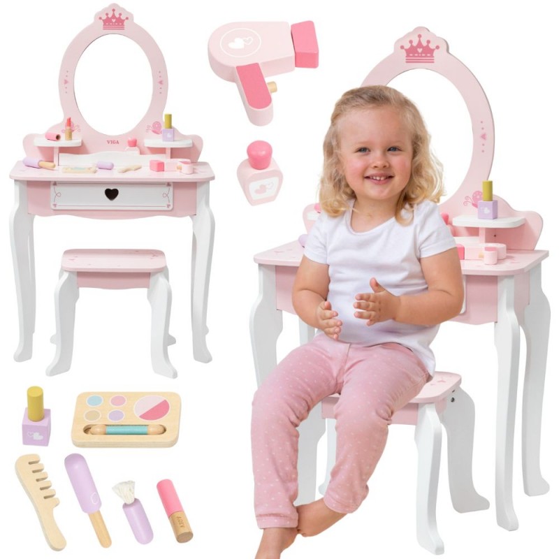 Duża Drewniana toaletka z marki Viga to wyjątkowa drewniana toaletka dla małej księżniczki, która spełni marzenia każdej dziewczynki! Wykonana z najwyższej jakości drewna, w delikatnych odcieniach różu i bieli, ta urocza toaletka zachwyca swoim bajkowym designem. Stylowe, zaokrąglone kształty, subtelne zdobienia i eleganckie nóżki sprawiają, że doskonale komponuje się w pokoju dziecięcym, dodając mu uroku i magii.Toaletka rozwija kreatywność, wyobraźnię i zachęca do odgrywania ról. Jest również doskonałym pomysłem na prezent – solidne wykonanie i estetyczny wygląd sprawią, że będzie służyć przez lata.