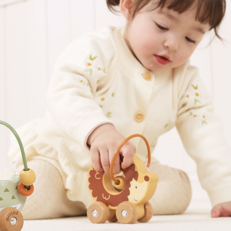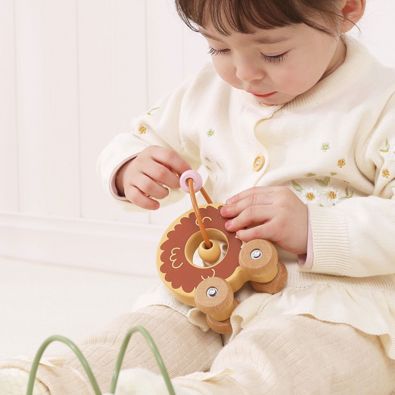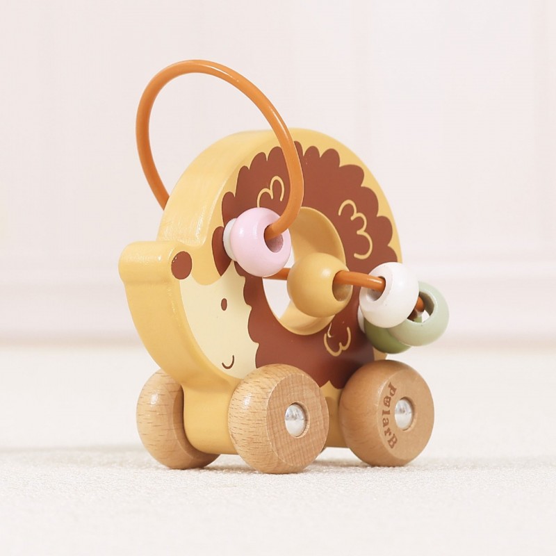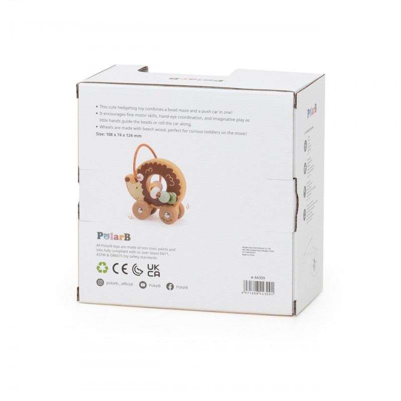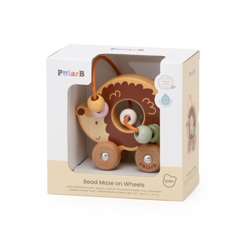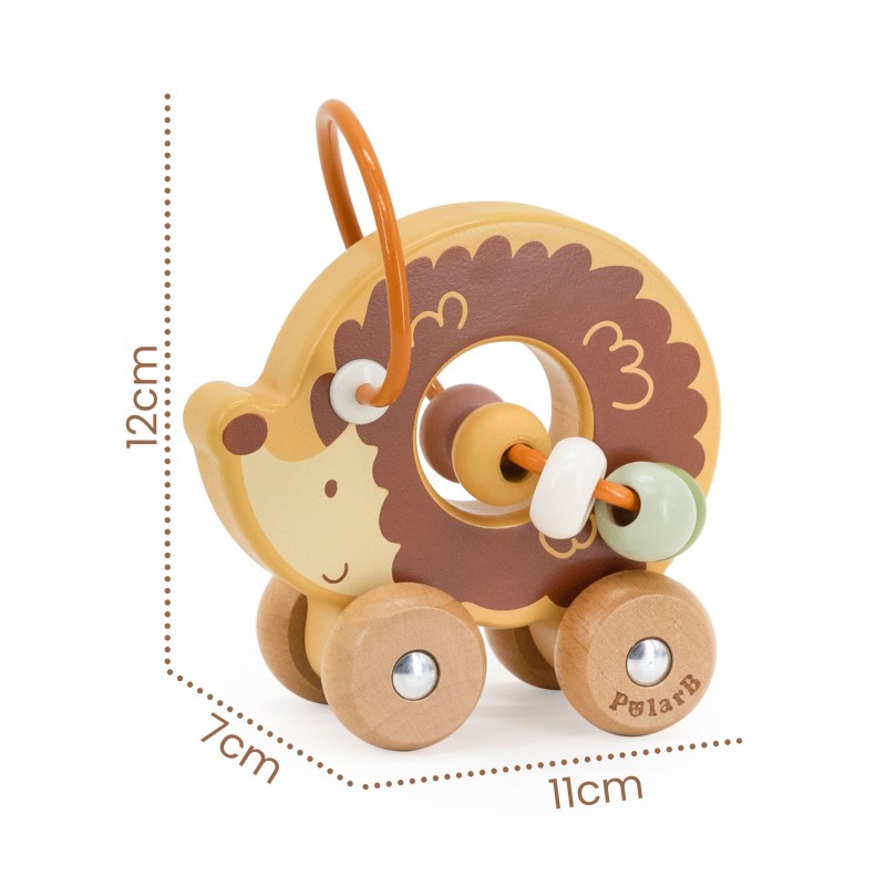 Uroczy labirynt koralikowy w kształcie jeża to idealna pierwsza zabawka edukacyjna dla malucha już od 12. miesiąca życia. Łączy w sobie funkcję labiryntu z koralikami oraz jeździka do pchania, zapewniając podwójną radość z zabawy. Dziecko może przesuwać kolorowe koraliki po pałąku lub toczyć zabawkę po podłodze, rozwijając swoje umiejętności ruchowe. Naturalne drewno bukowe i zaokrąglone krawędzie gwarantują bezpieczeństwo podczas zabawy. To doskonały wybór dla rodziców szukających trwałej, estetycznej i edukacyjnej zabawki.