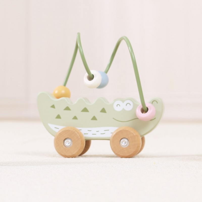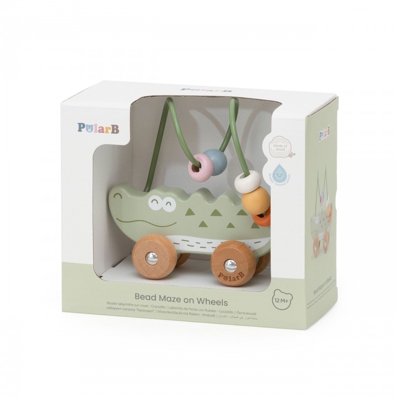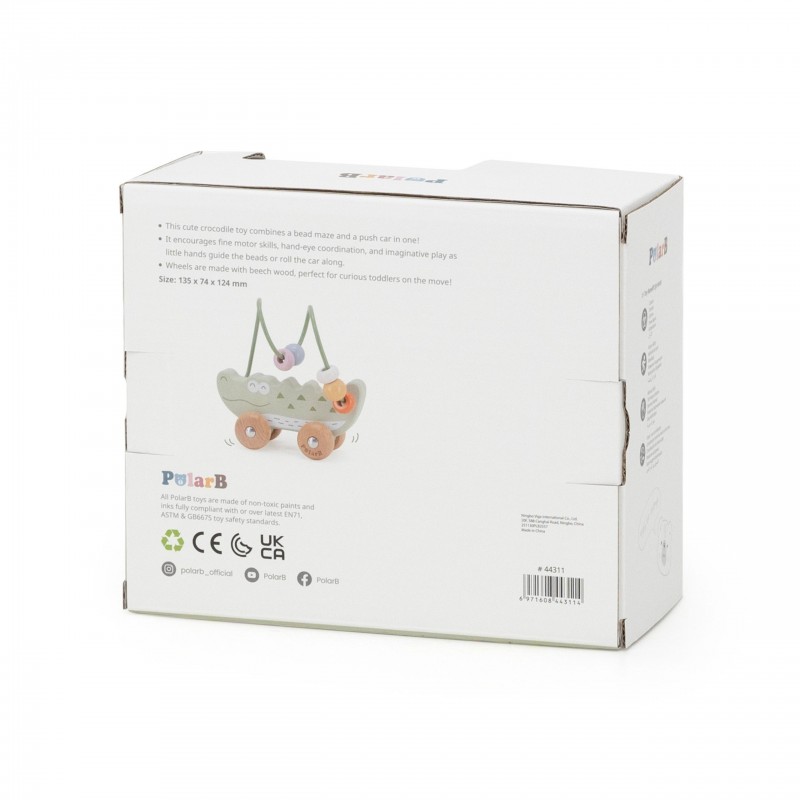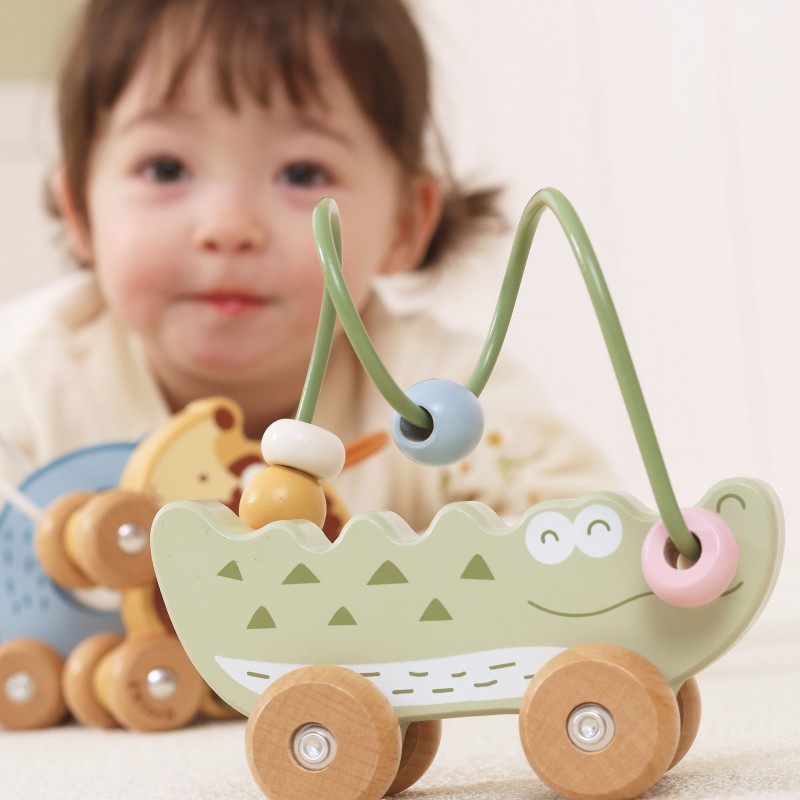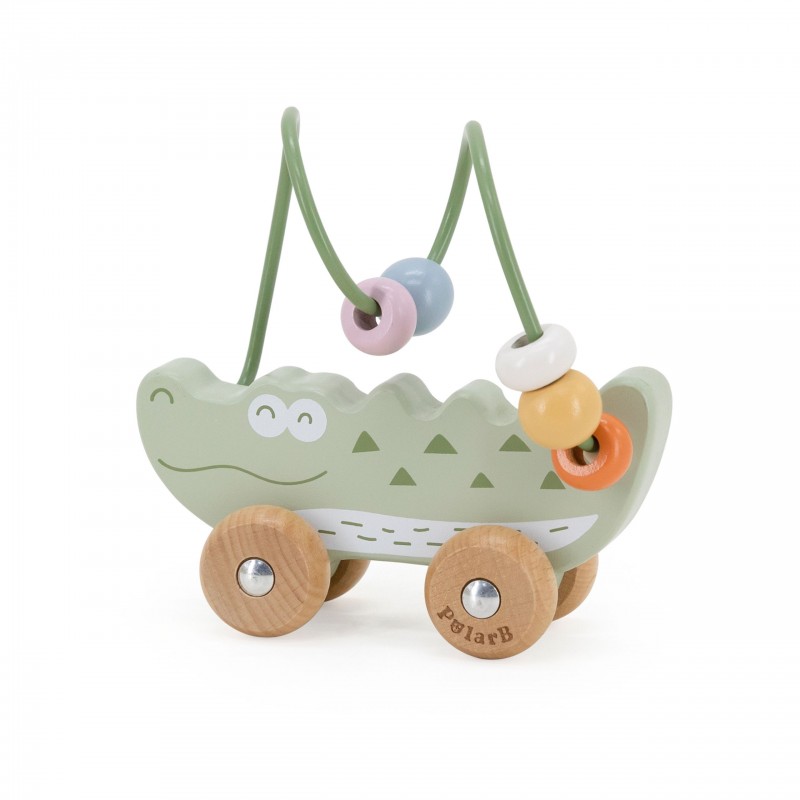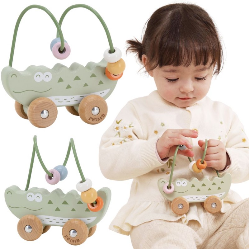 Uroczy labirynt koralikowy w kształcie Krokodyla to idealna pierwsza zabawka edukacyjna dla malucha już od 12. miesiąca życia. Łączy w sobie funkcję labiryntu z koralikami oraz jeździka do pchania, zapewniając podwójną radość z zabawy. Dziecko może przesuwać kolorowe koraliki po pałąku lub toczyć zabawkę po podłodze, rozwijając swoje umiejętności ruchowe. Naturalne drewno bukowe i zaokrąglone krawędzie gwarantują bezpieczeństwo podczas zabawy. To doskonały wybór dla rodziców szukających trwałej, estetycznej i edukacyjnej zabawki.
