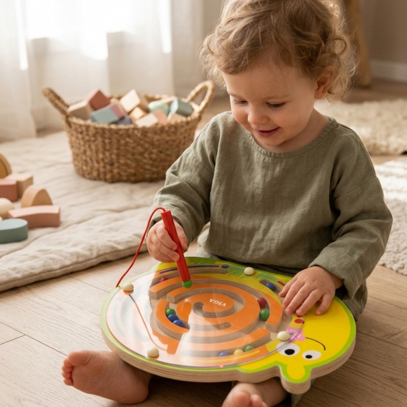 VIGA Labirynt magnetyczny Ślimak to fascynująca i kolorowa gra zręcznościowa, która angażuje maluchy w rozwijającą zabawę pełną skupienia. Drewniana plansza w kształcie sympatycznego ślimaka skrywa wewnątrz kręte ścieżki wypełnione metalowymi kuleczkami. Zadaniem dziecka jest prowadzenie kuleczek przez labirynt za pomocą magnetycznego rysika przymocowanego na sznurku. Całość została zabezpieczona przezroczystą szybką, co gwarantuje bezpieczeństwo i sprawia, że żaden element zabawki się nie zgubi. To idealna propozycja dla małych odkrywców, którzy uwielbiają manipulacyjne wyzwania.