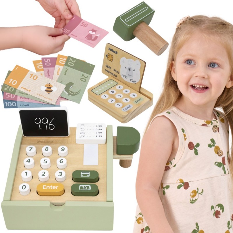Przenieś zabawę Twojego dziecka w świat zakupów z niezwykłą drewnianą kasą sklepową od marki VIGA PolarB – gotowa na godziny kreatywnej zabawy! Ta kolorowa, solidna kasa z wyjmowaną szufladą, banknotami, monetami i terminalem to prawdziwy hit podczas zabaw w sklep czy domowe przyjęcia. Dziecko może przyjmować płatności kartą lub gotówką, liczyć resztę i odgrywać rolę kasjera lub klienta. Zabawka rozwija umiejętność liczenia, komunikacji i logicznego myślenia, łącząc radość zabawy z nauką ważnych umiejętności. To idealny prezent dla malucha od 3 lat, który pokocha odgrywanie ról i codzienne zabawy społeczne!