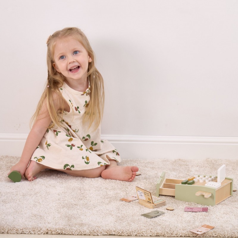 Kasa sklepowa to świetna drewniana zabawka, która pozwoli na odegranie wielu scenek, jakie mogą mieć miejsce w sklepie. Dzieci mogą wcielić się w role kasjera, lub klienta, oraz wspólnie ćwiczyć interakcje społeczne, oraz swoje zdolności komunikacyjne. Gotówka, czy karta? Policz sumę należności, przyjmij pieniądze i wydaj poprawnie resztę. Kasa zawiera banknoty, monety, oraz kartę płatniczą. Dziecko może uczyć się bawiąc! Królowa Nauk - matematyka nie będzie już straszna.
