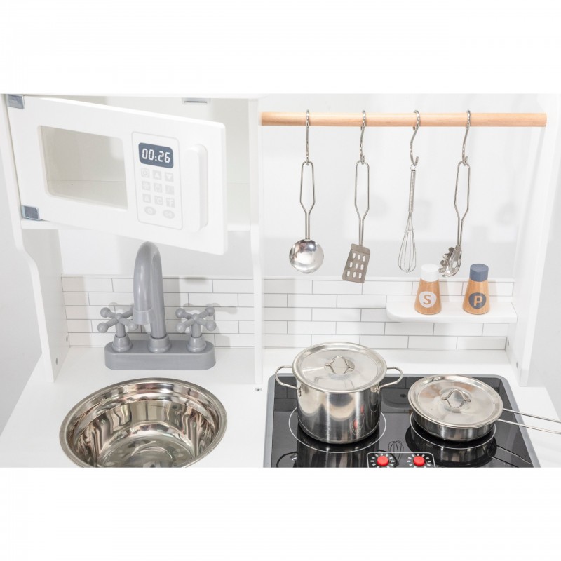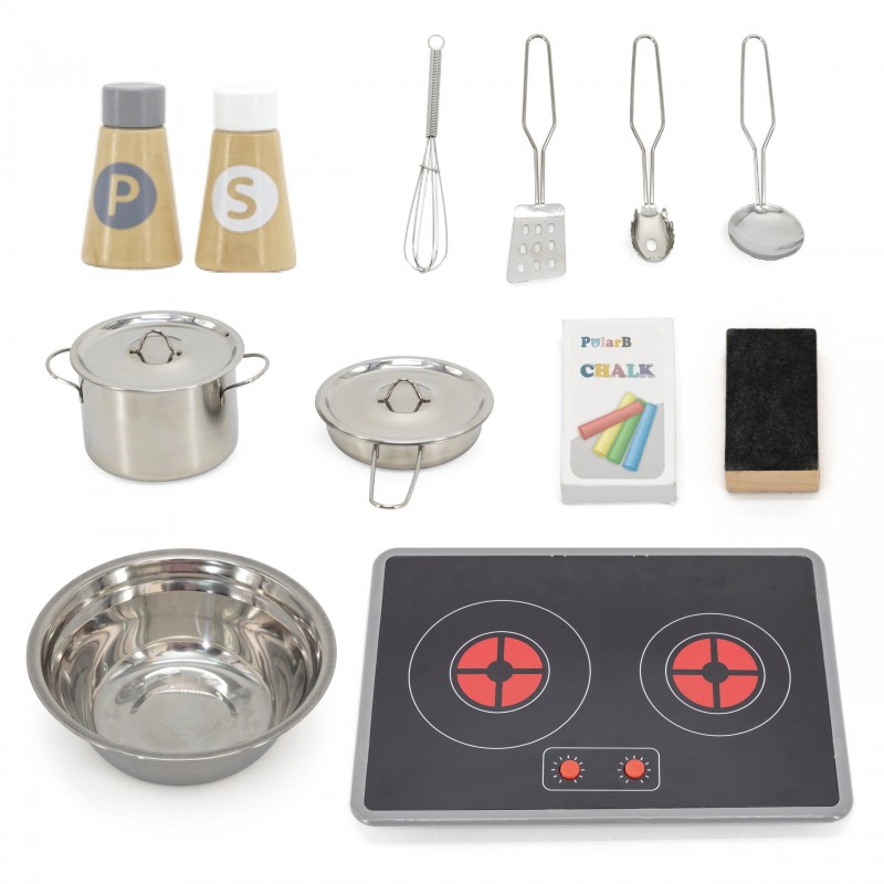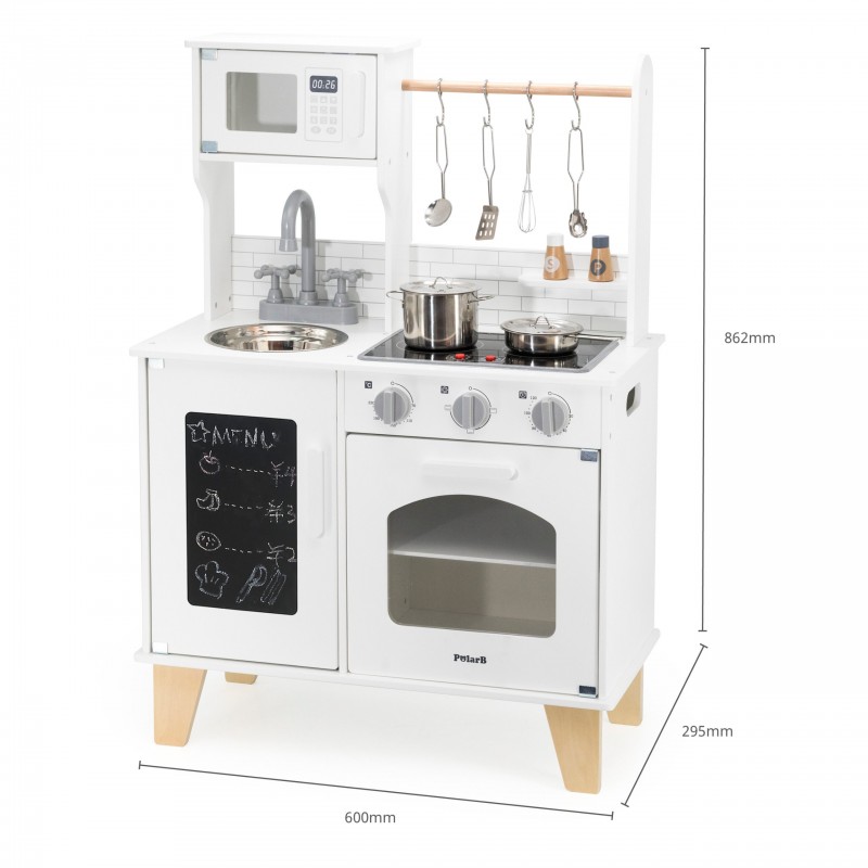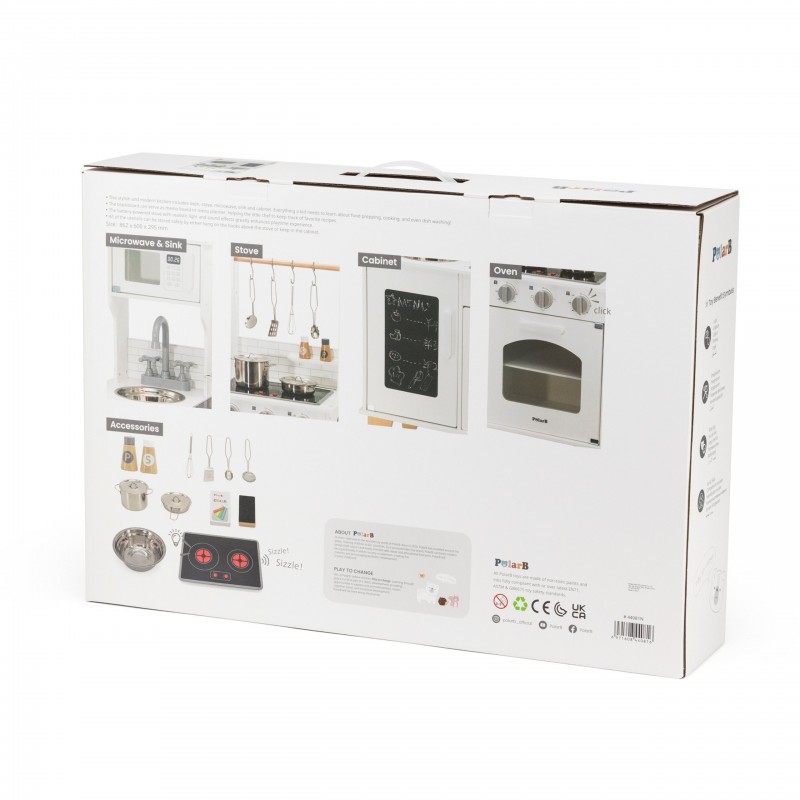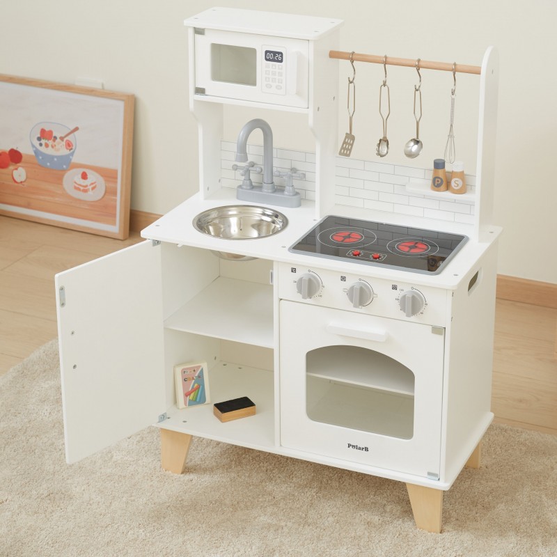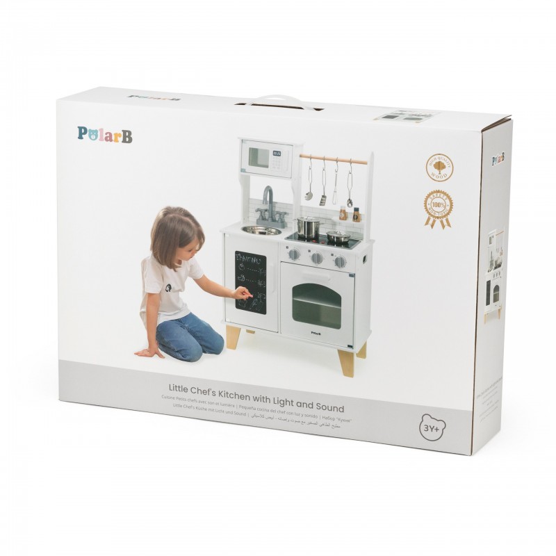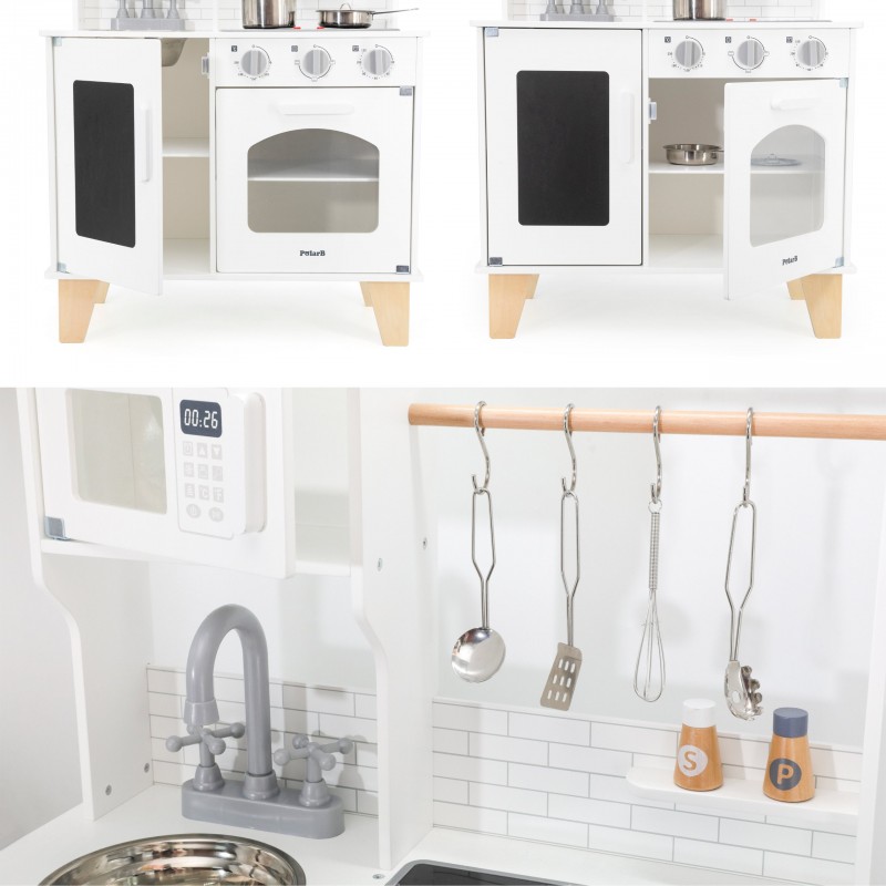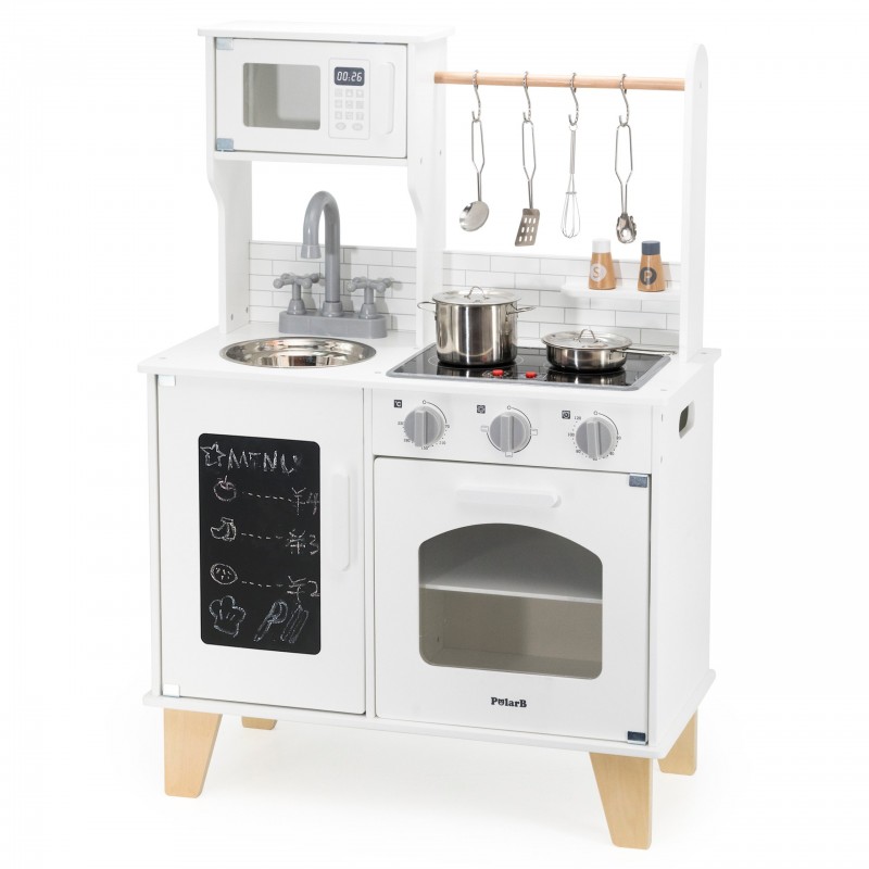 Drewniana kuchnia z tablicą od marki VIGA z serii PolarB to wymarzony mebel dla każdego małego kucharza i małej kucharki. Pozwala dzieciom naśladować dorosłych i wspólnie przygotowywać posiłki, łącząc naukę z doskonałą zabawą. Kuchnia została wyposażona w interaktywne detale, takie jak dźwięki gotowania i podświetlane palniki, a także pojemny zlew, piekarnik i frontową tablicę kredową idealną do rysowania oraz zapisywania ulubionych przepisów. Kuchenka znakomicie komponuje się z różnymi zestawami naczyń, stanowiąc wspaniałe zaplecze do kreatywnej zabawy w odgrywanie ról.