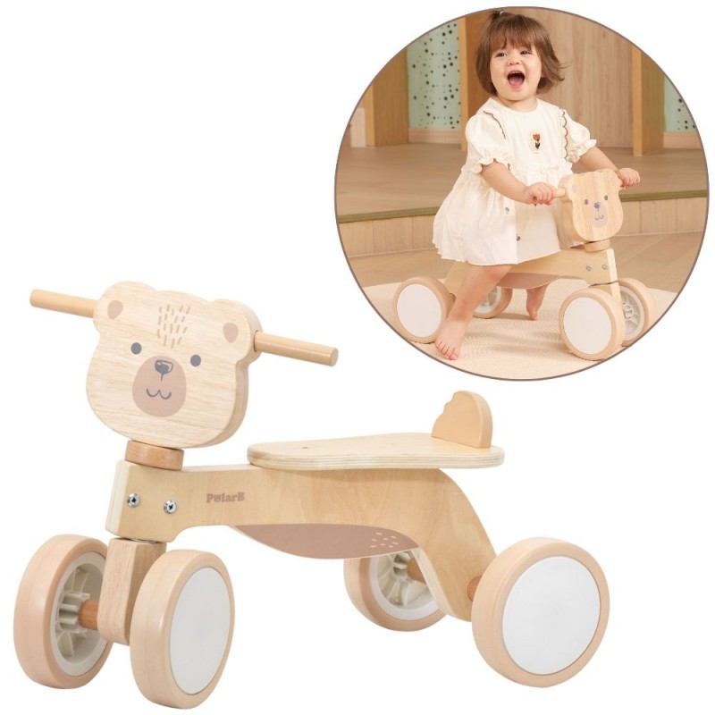 Drewniany jeździk trójkołowy z misiem brunatnym – bezpieczna i aktywna zabawa!
