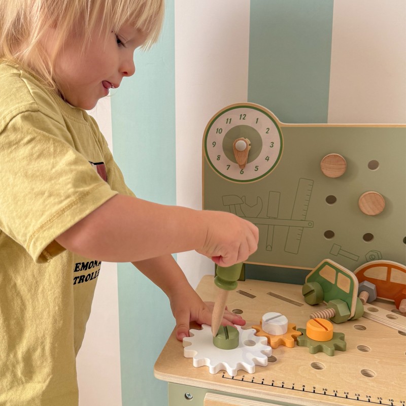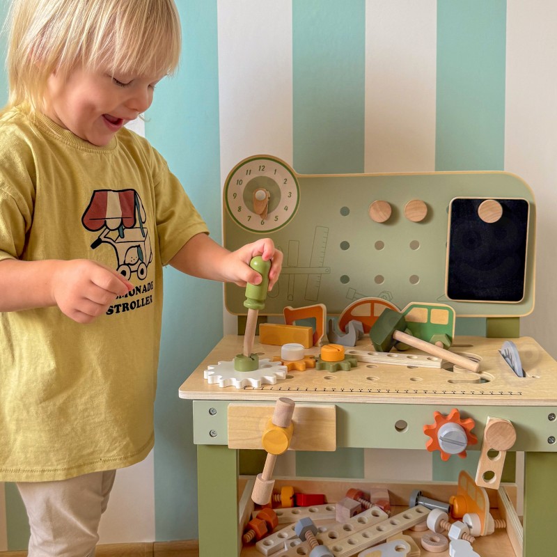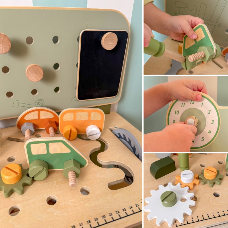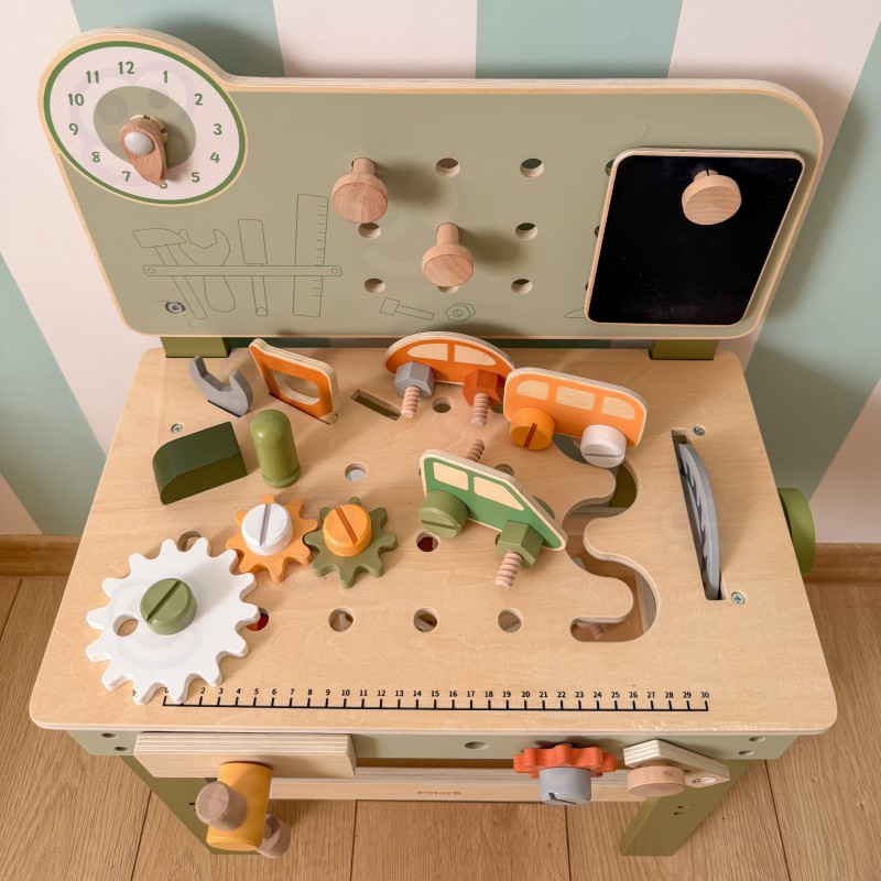 Uwielbiamy zabawki eko - ten warsztat to nasz ratunek - synek ciągle się nim bawi, coś przykręca, odkręca, konstruuje nowe rzeczy - a wszystko w fajnych stonowanych kolorach i z motywem uroczych zwierzątek