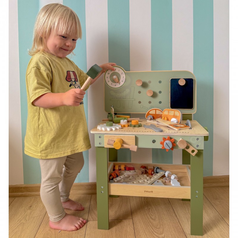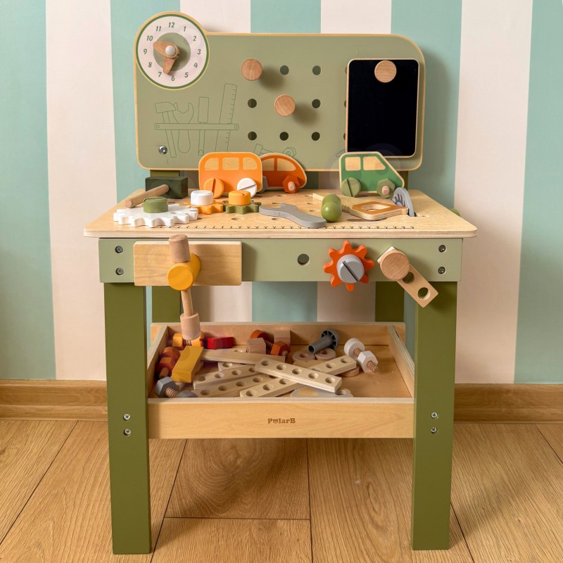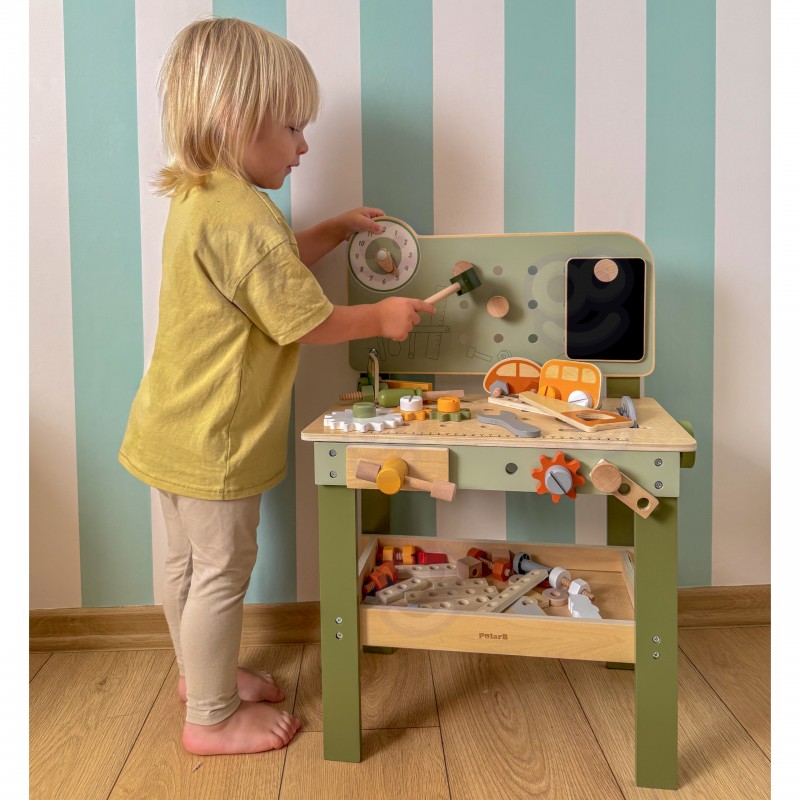 Warsztat majsterkowicza od marki Viga Toys z ekskluzywnej serii PolarB pozwoli poczuć się Twojemu dziecku jak prawdziwy mechanik. Dziecko może wbijać gwoździe, dokręcać śruby kluczem, a także przykręcać drewniane deski i zębatki do stołu warsztatowego. Zabawka posiada zegar ze wskazówkami, drewniane samochodziki oraz różne narzędzia.