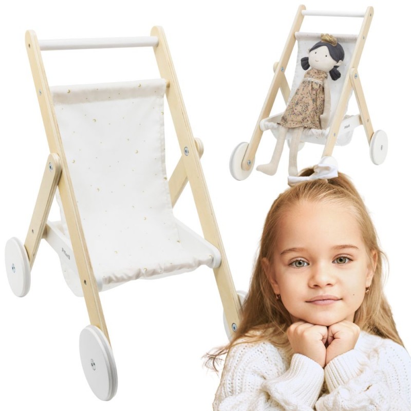 Drewniany wózek spacerowy od marki VIGA z serii PolarB to piękna zabawka, która przenosi dziecko w świat opieki nad lalką i radosnej zabawy. Stelaż wykonany jest z solidnego drewna bukowego, a materiał gondolki ozdobiono uroczym nadrukiem gwiazd i księżyca. Duże koła z dodatkiem gumy zapewniają stabilne i ciche prowadzenie, dzięki czemu maluch może „spacerować” po różnorodnych powierzchniach. Pod siedziskiem wózka znajduje się praktyczny koszyk, idealny na drobne akcesoria lalek, co zwiększa funkcjonalność zabawki. To nie tylko zabawa — wózek wspiera rozwój empatii, wyobraźni i zdolności motorycznych Twojego dziecka.