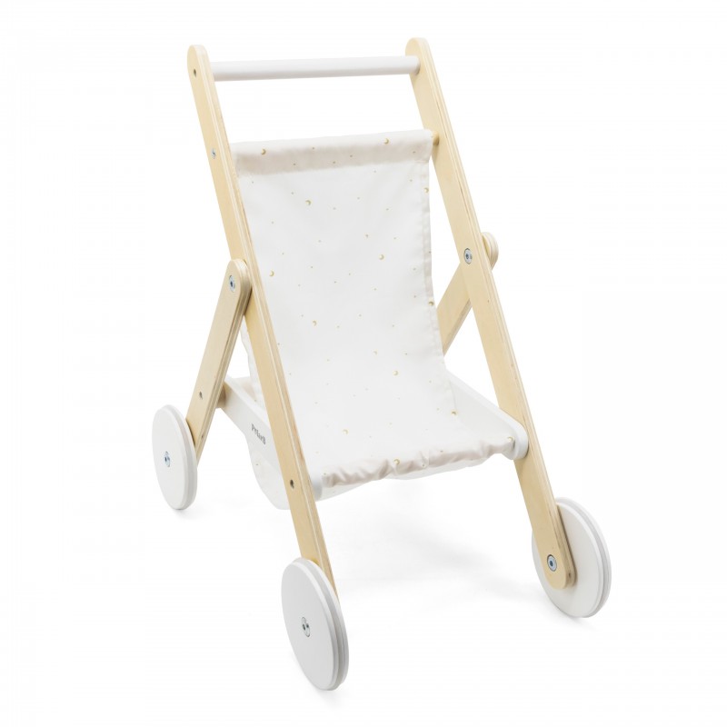 Drewniany wózek spacerowy od marki VIGA z serii PolarB to piękna zabawka, która przenosi dziecko w świat opieki nad lalką i radosnej zabawy. Stelaż wykonany jest z solidnego drewna bukowego, a materiał gondolki ozdobiono uroczym nadrukiem gwiazd i księżyca. Duże koła z dodatkiem gumy zapewniają stabilne i ciche prowadzenie, dzięki czemu maluch może „spacerować” po różnorodnych powierzchniach. Pod siedziskiem wózka znajduje się praktyczny koszyk, idealny na drobne akcesoria lalek, co zwiększa funkcjonalność zabawki. To nie tylko zabawa — wózek wspiera rozwój empatii, wyobraźni i zdolności motorycznych Twojego dziecka.