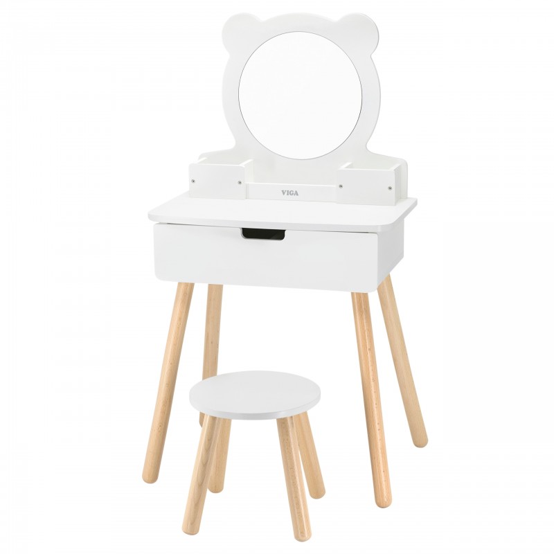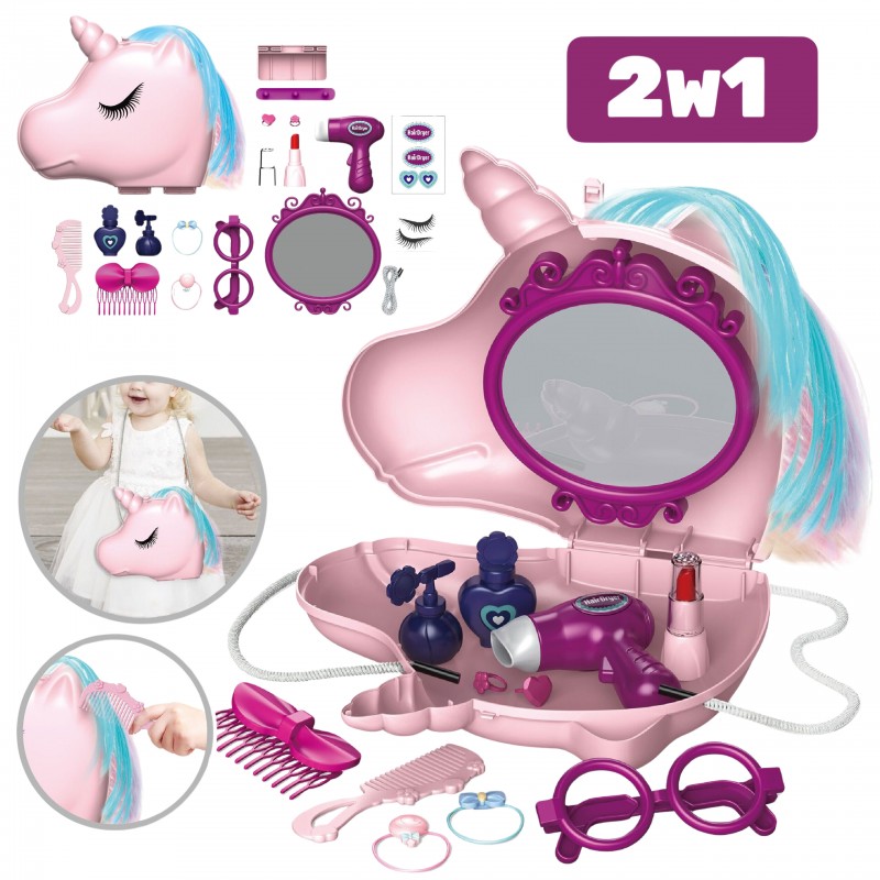 Duża, wolnostojąca biała toaletka + zestaw akcesoriów w pięknej torbie jednorożca od marki Viga to wymarzony komplet w pokoju każdej dziewczynki. Toaletka posiada wysuwaną szufladę, w której mała księżniczka może schować swoje skarby. Pod samym lustrem znajdują się przegródki na poręczne akcesoria. W zestawie znajdziemy również krzesełko do toaletki. W torebce jednorożca, znajdują się wszystkie niezbędne akcesoria jak z salonu piękności.