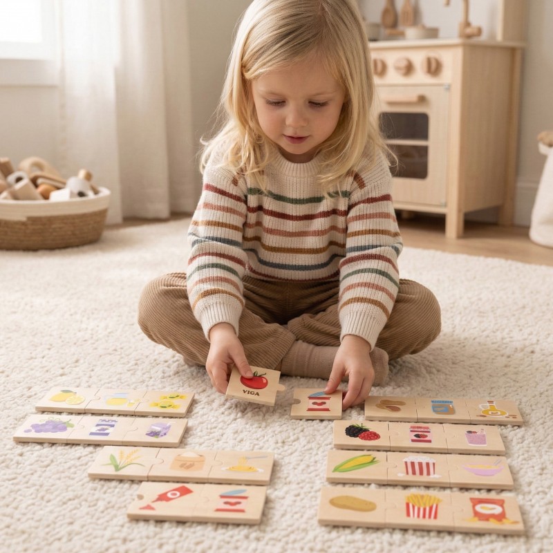VIGA Zestaw Puzzli Odkrywaj Związki Między Naturą a Jedzeniem uczy dzieci w zabawny sposób, jak produkty roślinne są przetwarzane na pyszne produkty spożywcze. Dopasowując rośliny i zbiory do produktów, takich jak popcorn, płatki zbożowe, masło orzechowe czy makaron, maluchy odkrywają, skąd pochodzą te codzienne przysmaki. Tego rodzaju zabawa rozwija zrozumienie procesów związanych z produkcją żywności i zachęca do poznawania etapów przetwarzania plonów.