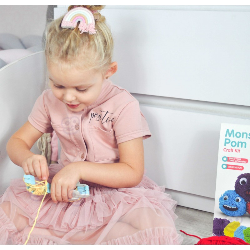 Zestaw Kreatywny Monster Pom od marki WOOPIE z serii ART&FUN dostarczy straszliwą ilość kreatywnej zabawy! Zrób swojego własnego potwora! Ogranicza Cię jedynie Twoja własna wyobraźnia! Zestaw pozwala na stworzenie dowolnego kudłatego potworka za pomocą m.in. specjalnego sprzętu i włóczki oraz zawiera dodatki takie jak oczy czy rogi. Dodatkowo zawiera na 3 kartach aż 21 filcowych elementów (usta, zęby itp.), z których możesz stworzyć niepowtarzalną minę. Żadne dziecko nie powinno mieć problemu ze stworzeniem swojego potworka, ponieważ z tyłu opakowania jest zawarta obrazkowa instrukcja tworzenia. W skrócie zawijamy oba ramiona sprzętu włóczką, następnie przecinamy, wiążemy sznurkiem przez środek, ściągamy sprzęt i mamy gotowe ciało naszego potworka. Następnie dekorujemy potwora i gotowe. przecinamy Zabawy plastyczne dodatkowo rozwijają zdolności manualne u dzieci tzw. "małą motorykę". Zestaw jest świetnym pomysłem na zabawę w gronie przyjaciół - stworzenie własnych potworków oraz ich historię w zabawie!