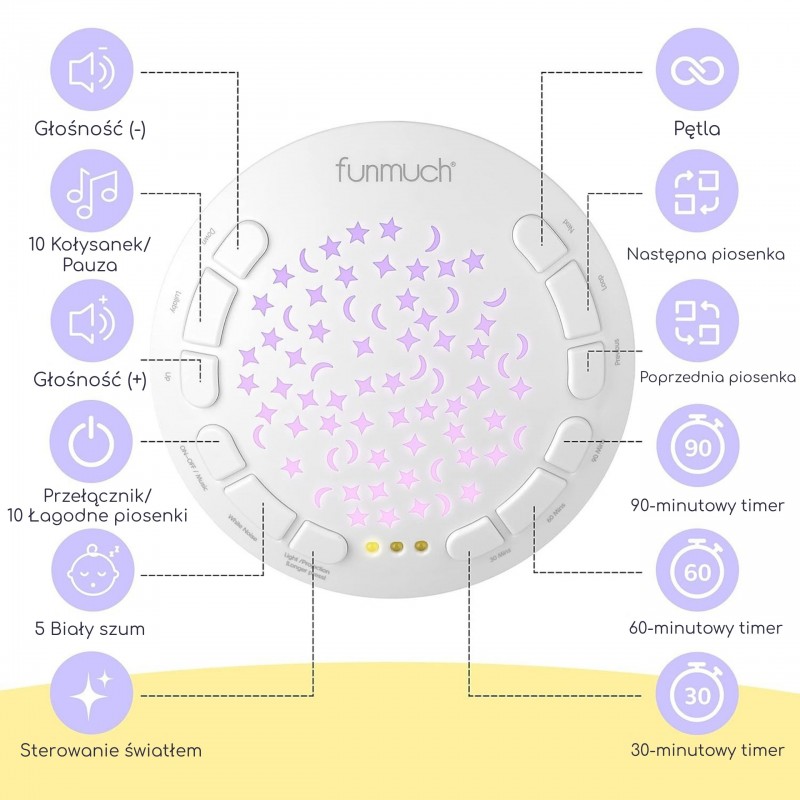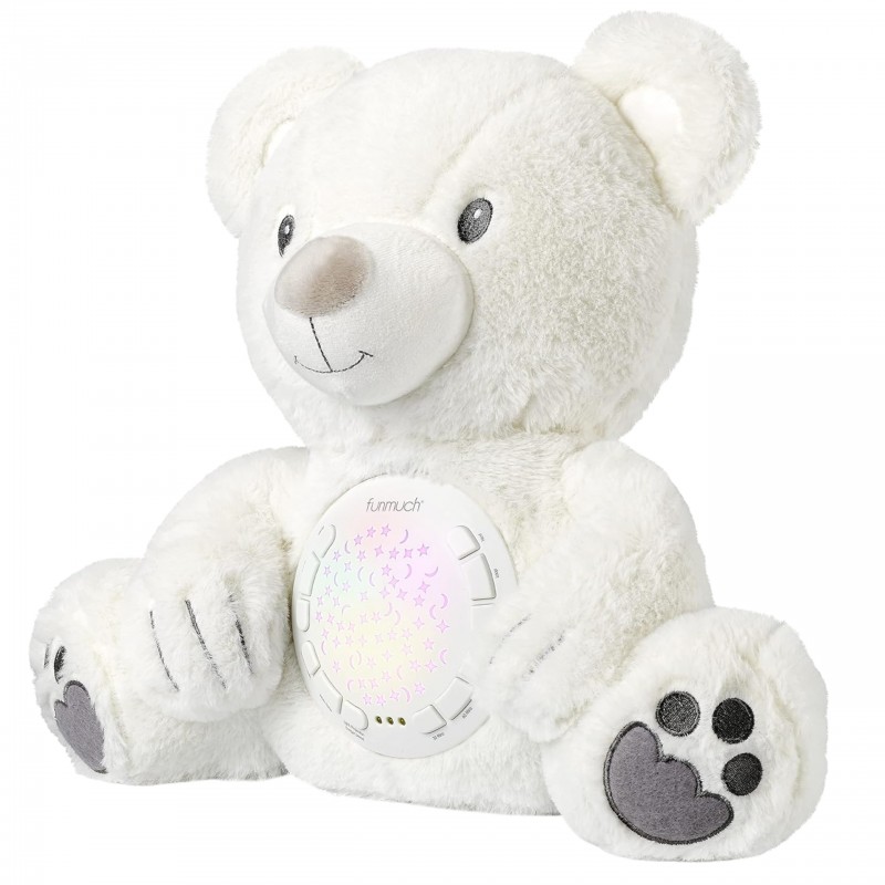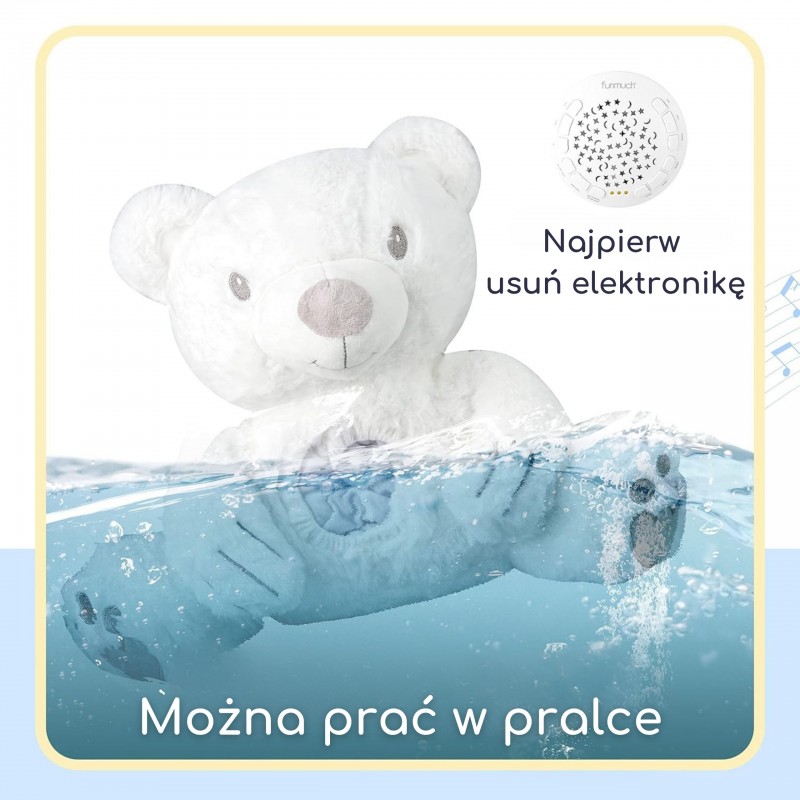 Mięciutki Miś Polarny z Projektorem od marki Woopie to idealny towarzysz snu dla każdego maluszka. Ta urocza przytulanka, wykonana z bezpiecznej, bawełnianej tkaniny, łączy w sobie funkcje projektora świetlnego i uspokajacza z muzyką. Miś pomaga ukoić dziecko do snu, emitując na suficie gwieździste niebo z księżycami w różnych efektach świetlnych. Moduł świetlny posiada wbudowaną ,klasyczną nakręcaną pozytywkę z przyjemną melodyjką. Dodatkową zaletą jest możliwość prania misia w pralce (po wyjęciu modułu elektronicznego).