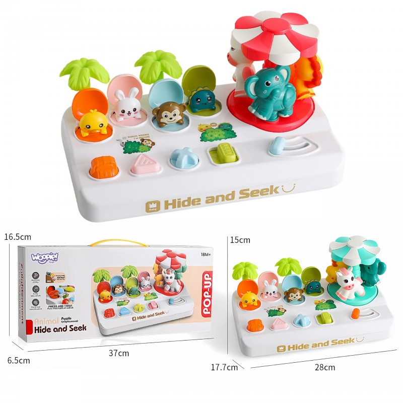 Interaktywna zabawka edukacyjna Wyskakujące Zwierzątka od marki Wopie to prawdziwy hit wśród zabawek dla najmłodszych. To nie tylko kolorowa atrakcja wizualna, ale przede wszystkim przemyślane narzędzie do wspierania wieloaspektowego rozwoju dziecka. Łącząc elementy klasycznej zabawy z nowoczesnymi rozwiązaniami edukacyjnymi, zabawka skutecznie wspiera rozwój umiejętności motorycznych, poznawczych i sensorycznych u maluchów. Zestaw składa się z czterech uroczych zwierzątek ukrytych pod kolorowymi klapkami. Każde zwierzątko chowa się w osobnej komorze, aktywowanej różnymi mechanizmami – naciśnięciem, przekręceniem czy przesunięciem. Dodatkowo obok znajduje się karuzela z trzema zwierzątkami, która obraca się po przesunięciu dźwigni.Te różnorodne formy interakcji uczą dziecko zależności przyczynowo-skutkowych, wzmacniają koncentrację oraz wspierają rozwój manualny i koordynacyjny. Zabawa jest niezwykle wciągająca i rozwija także zdolność rozpoznawania kształtów i kolorów. Każdy przycisk ma unikalny kształt (np. gwiazda, trójkąt, kwadrat) i odpowiada konkretnemu zwierzątku. Dzięki temu dziecko uczy się logicznego myślenia oraz doskonali zdolność dopasowywania form. Całość została wykonana z nietoksycznych, trwałych i bezpiecznych materiałów, z dbałością o detale i bezpieczeństwo najmłodszych. Wszystkie krawędzie są zaokrąglone, a mechanizmy działają na zasadzie sprężynowej, bez użycia baterii, co sprawia, że zabawka jest w pełni mechaniczna i ekologiczna. Dzięki kompaktowym wymiarom i solidnej budowie, doskonale sprawdzi się zarówno w domu, jak i podczas podróży – zmieści się na stoliku, w bagażu czy na kolanach dziecka.